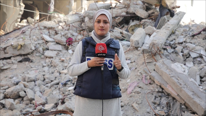 Lors de la rencontre d'un groupe de femmes et de filles avec le Guide de la Révolution, un message vidéo de Mme Esra Albohaisi, journaliste du réseau Al-Alam, a été diffusé depuis les ruines de la ville de Gaza, dans la Husseinyah de l'Imam Khomeiny où se tenait cette rencontre.