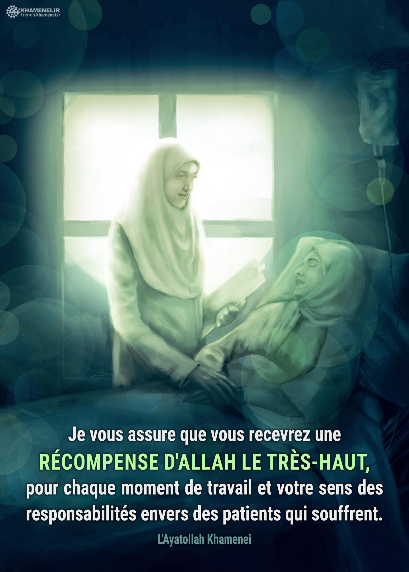 Je vous assure que vous recevrez une récompense d'Allah le Très-Haut, pour chaque moment de travail et votre sens des responsabilités envers des patients qui souffrent. Pas un seul instant ne restera sans récompense. Il ne faut pas penser que les moments douloureux qu'un infirmier passe au chevet d'un patient ne sont pas remarqués par Dieu. Chaque instant de votre travail et tous les efforts que vous faites méritent une récompense divine. 21 avril 2010