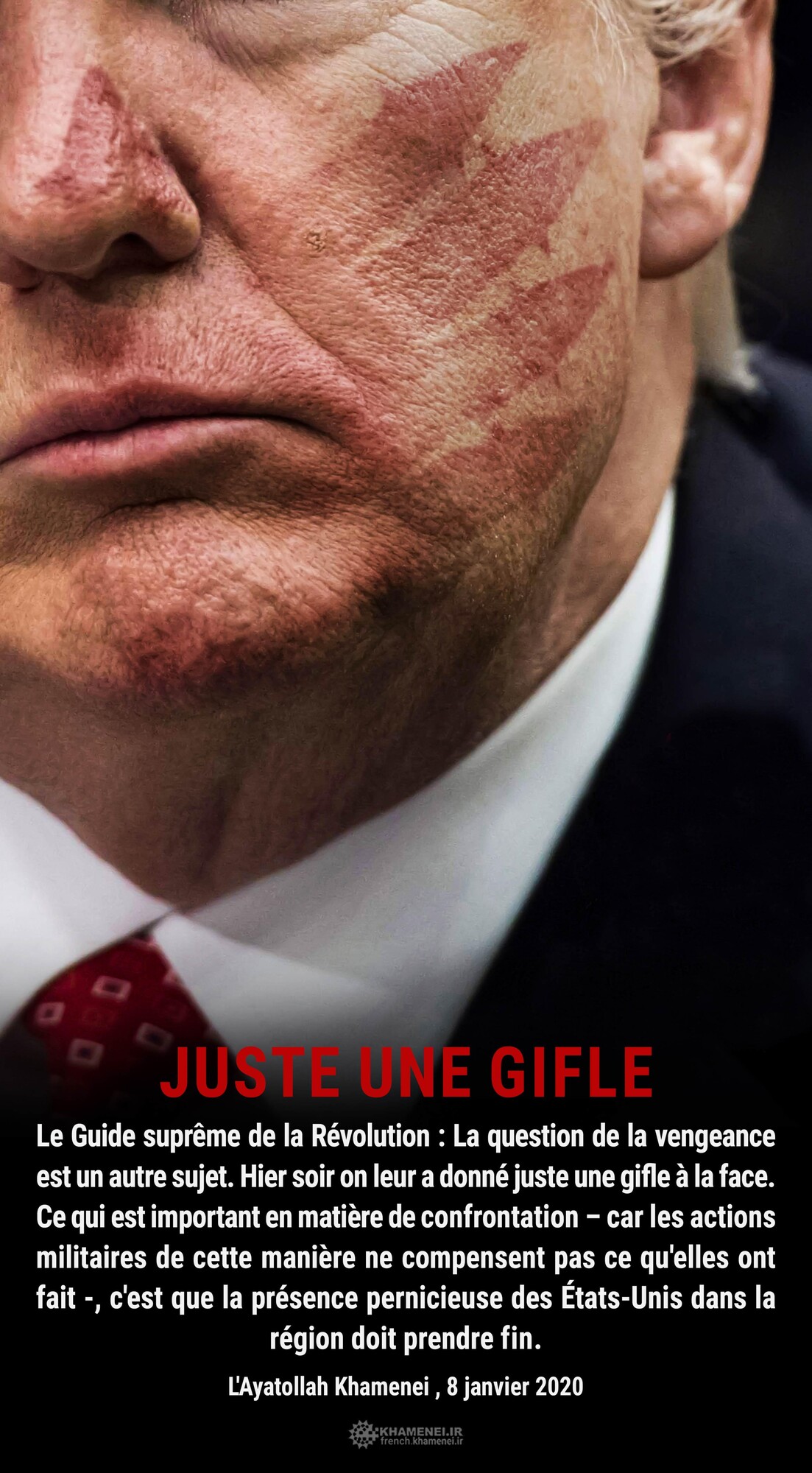 La question de la vengeance est un autre sujet. Hier soir on leur a donné juste une gifle à la face. Ce qui est important en matière de confrontation – car les actions militaires de cette manière ne compensent pas ce qu'elles ont fait -, c'est que la présence pernicieuse des États-Unis dans la région doit prendre fin. 8 janvier 2020