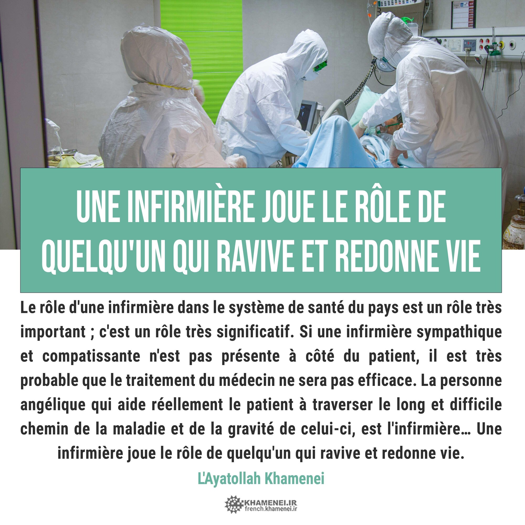 Le rôle d'une infirmière dans le système de santé du pays est un rôle très important ; c'est un rôle très significatif. Si une infirmière sympathique et compatissante n'est pas présente à côté du patient, il est très probable que le traitement du médecin ne sera pas efficace. La personne angélique qui aide réellement le patient à traverser le long et difficile chemin de la maladie et de la gravité de celui-ci, est l'infirmière… Une infirmière joue le rôle de quelqu'un qui ravive et redonne vie. 29 avril 2009