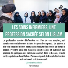 La profession sacrée d'infirmière est l'un de ces emplois, qui consiste essentiellement à aider les gens besogneux. Un patient a à la fois besoin d'aide et n'est pas en mesure d'atteindre ce dont il a besoin. Prendre soin des malades signifie aider et subvenir aux besoins de quelqu'un qui est impuissant et dans le besoin, et cela est très précieux dans l'Islam. Par conséquent, le travail d'infirmière est un travail précieux en soi. 4 octobre 1995