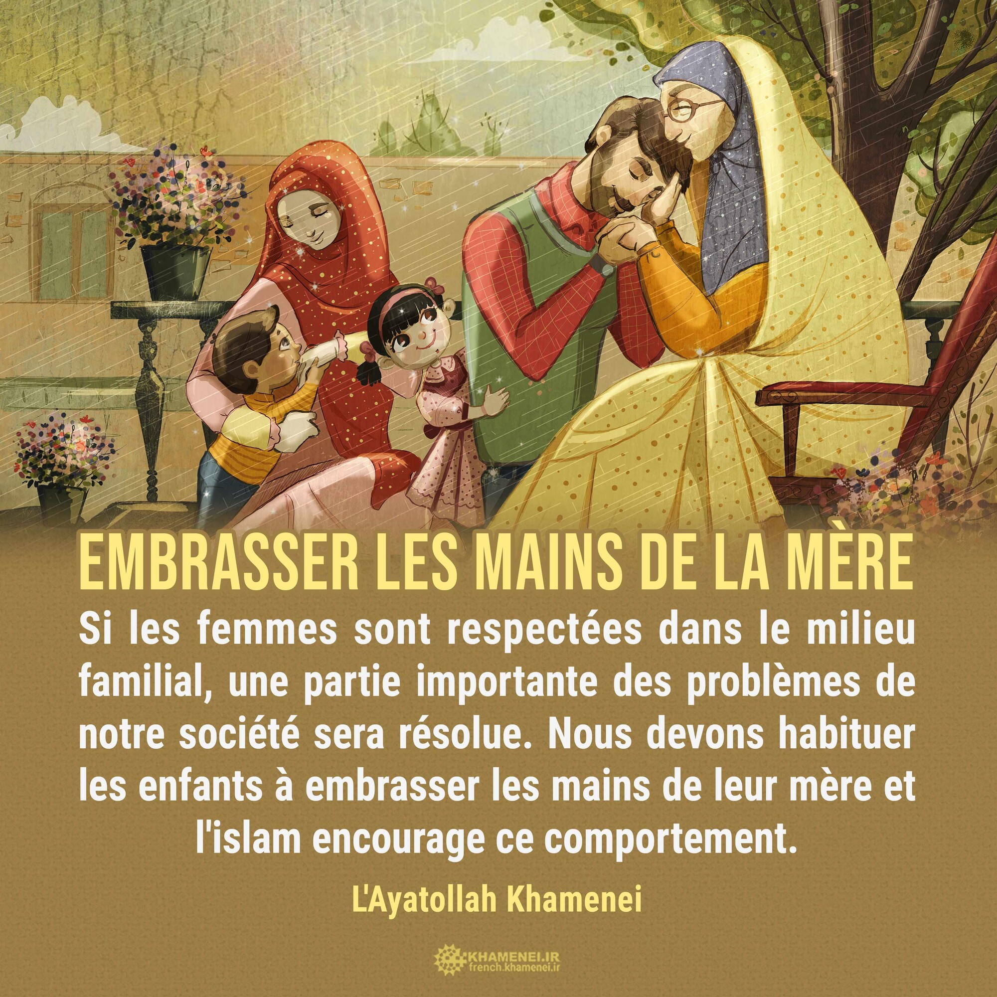 Si les femmes sont respectées dans le milieu familial, une partie importante des problèmes de notre société sera résolue. Nous devons habituer les enfants à embrasser les mains de leur mère et l'islam encourage ce comportement.   L’Ayatollah Khamenei 11 mai 2013