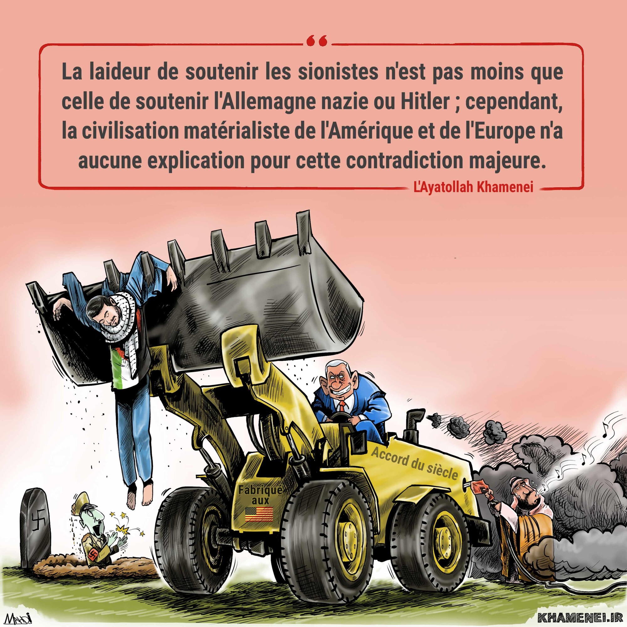 La laideur de soutenir les sionistes n'est pas moins que celle de soutenir l'Allemagne nazie ou Hitler ; cependant, la civilisation matérialiste de l'Amérique et de l'Europe n'a aucune explication pour cette contradiction majeure. Les Occidentaux dénoncent le racisme nazi contre les Juifs, mais soutiennent les sionistes qui sont similaires aux nazis, à bien des égards.