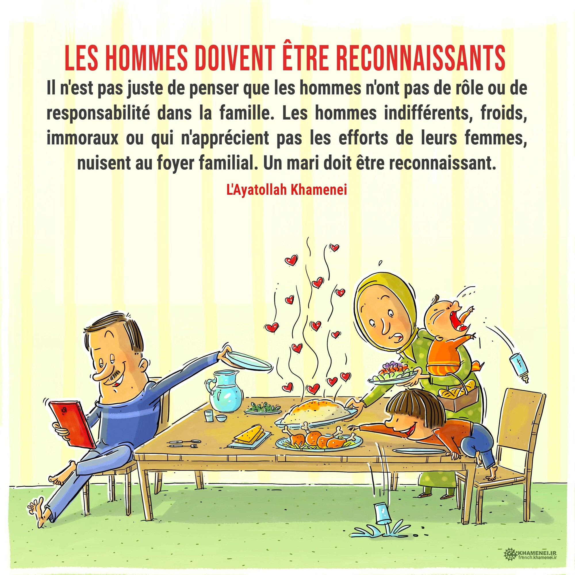 Il n'est pas juste de penser que les hommes n'ont pas de rôle ou de responsabilité dans la famille. Les hommes indifférents, froids, immoraux ou qui n'apprécient pas les efforts de leurs femmes, nuisent au foyer familial. Un mari doit être reconnaissant. 4 janvier 2012