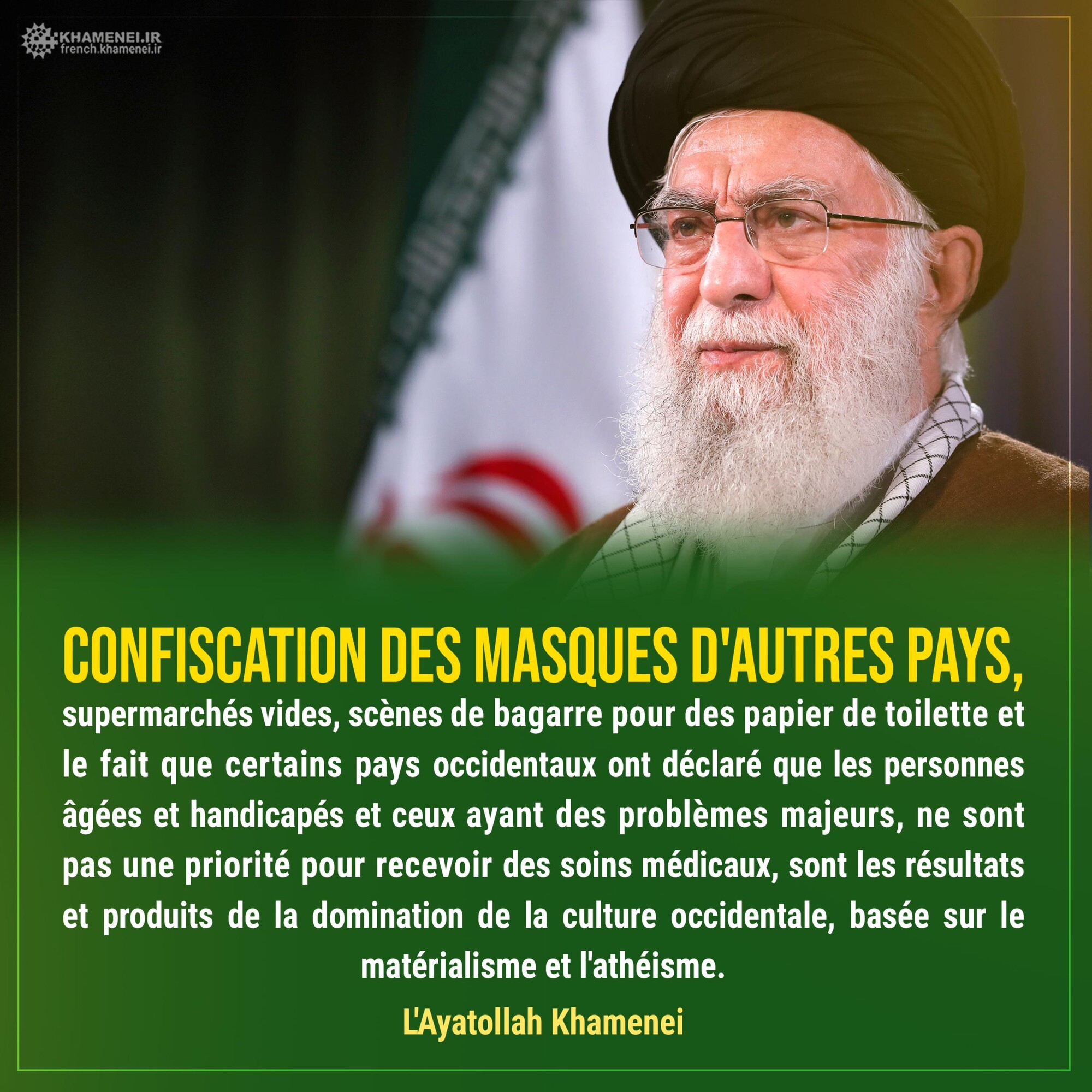 Confiscation des masques d'autres pays, supermarchés vides, scènes de bagarre pour des papier de toilette et le fait que certains pays occidentaux ont déclaré que les personnes âgées et handicapés et ceux ayant des problèmes majeurs, ne sont pas une priorité pour recevoir des soins médicaux, sont les résultats et produits de la domination de la culture occidentale, basée sur le matérialisme et l'athéisme.