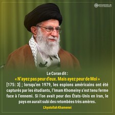 Le Coran dit : « N’ayez pas peur d'eux. Mais ayez peur de Moi » [3 :175] ; lorsqu’en 1979, les espions américains ont été capturés par les étudiants, l’Imam Khomeiny s’est tenu ferme face à l’ennemi. Si l’on avait peur des États-Unis en Iran, le pays en aurait subi des retombées très amères.