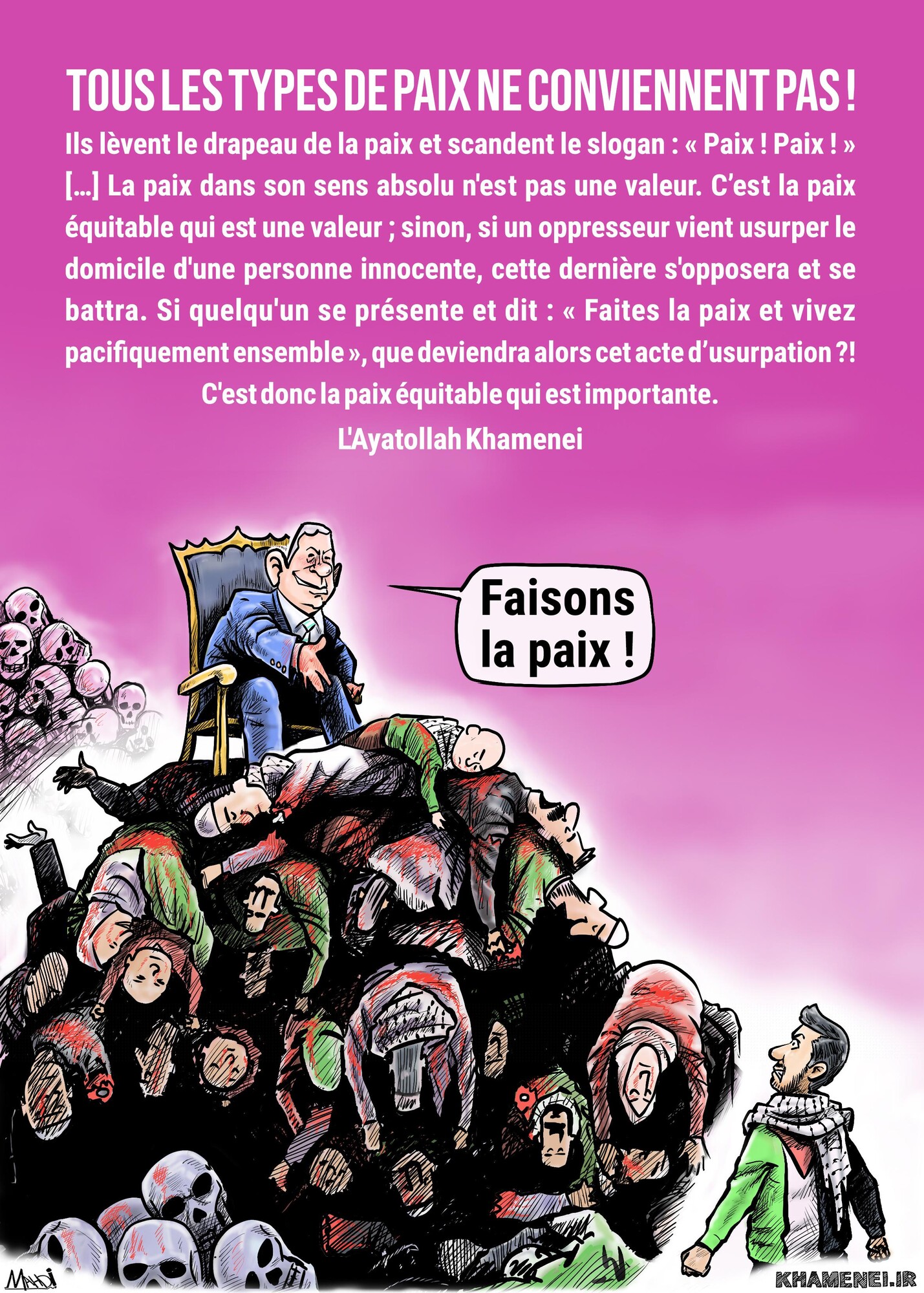 Ils lèvent le drapeau de la paix et scandent le slogan : « Paix ! Paix ! » Ils pensent que la paix, dans son sens littéral, est une valeur. Cependant, la paix dans son sens absolu n'est pas une valeur. C’est la paix équitable qui est une valeur ; sinon, si un oppresseur vient usurper le domicile d'une personne innocente, cette dernière s'opposera et se battra. Si quelqu'un se présente et dit : « Faites la paix et vivez pacifiquement ensemble », que deviendra alors cet acte d’usurpation ?! C'est donc la paix équitable qui est importante.