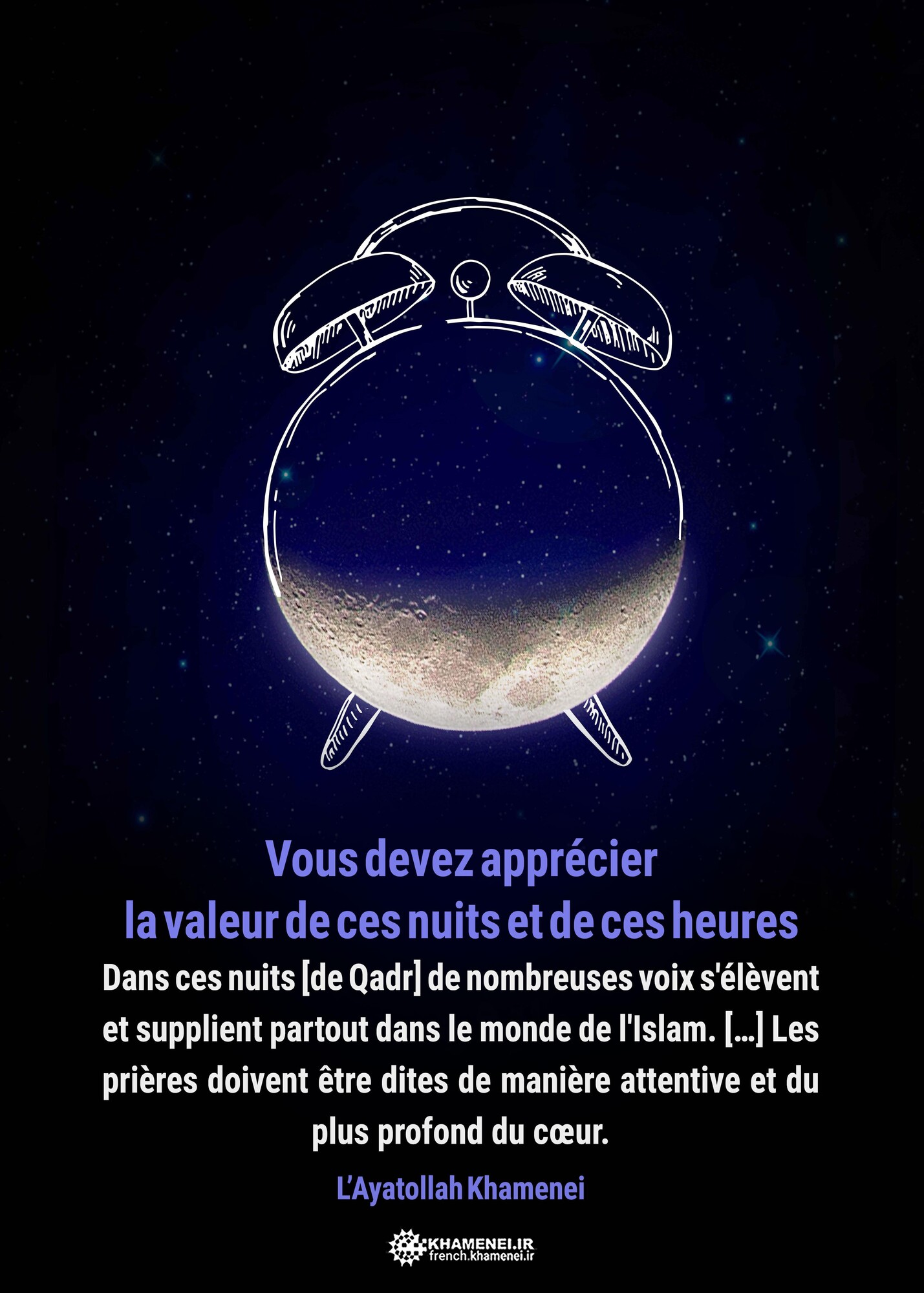 Vous devez apprécier la valeur de ces nuits et de ces heures, prier pour vous-mêmes, supplier Dieu d’exhausser vos vœux et les vœux des autres aussi. Dans ces nuits […] de nombreuses voix s'élèvent et supplient partout dans le monde de l'Islam, et dans tous les endroits où les gens croient que : « Beaucoup de voix et de cris s’élèveront vers Toi avec des mots de diverses sortes » [Iqbal al-A'mal, Vol 1, p 346]. Durant ces nuits, des voix s'élèveront partout et de nombreuses larmes seront versées. Les gens prient pour eux-mêmes et pour les autres. Une de vos prières devrait être de demander à Allah le Très-Haut, de répondre aux prières des croyants qui prient dans ces nuits. Vous devriez le demander à Dieu. Les prières doivent être dites de manière attentive et du plus profond du cœur. Imam Khamenei, 25 juin 2016