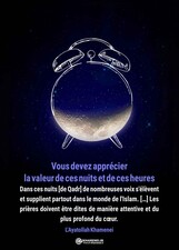 Vous devez apprécier la valeur de ces nuits et de ces heures, prier pour vous-mêmes, supplier Dieu d’exhausser vos vœux et les vœux des autres aussi. Dans ces nuits […] de nombreuses voix s'élèvent et supplient partout dans le monde de l'Islam, et dans tous les endroits où les gens croient que : « Beaucoup de voix et de cris s’élèveront vers Toi avec des mots de diverses sortes » [Iqbal al-A'mal, Vol 1, p 346]. Durant ces nuits, des voix s'élèveront partout et de nombreuses larmes seront versées. Les gens prient pour eux-mêmes et pour les autres. Une de vos prières devrait être de demander à Allah le Très-Haut, de répondre aux prières des croyants qui prient dans ces nuits. Vous devriez le demander à Dieu. Les prières doivent être dites de manière attentive et du plus profond du cœur. Imam Khamenei, 25 juin 2016