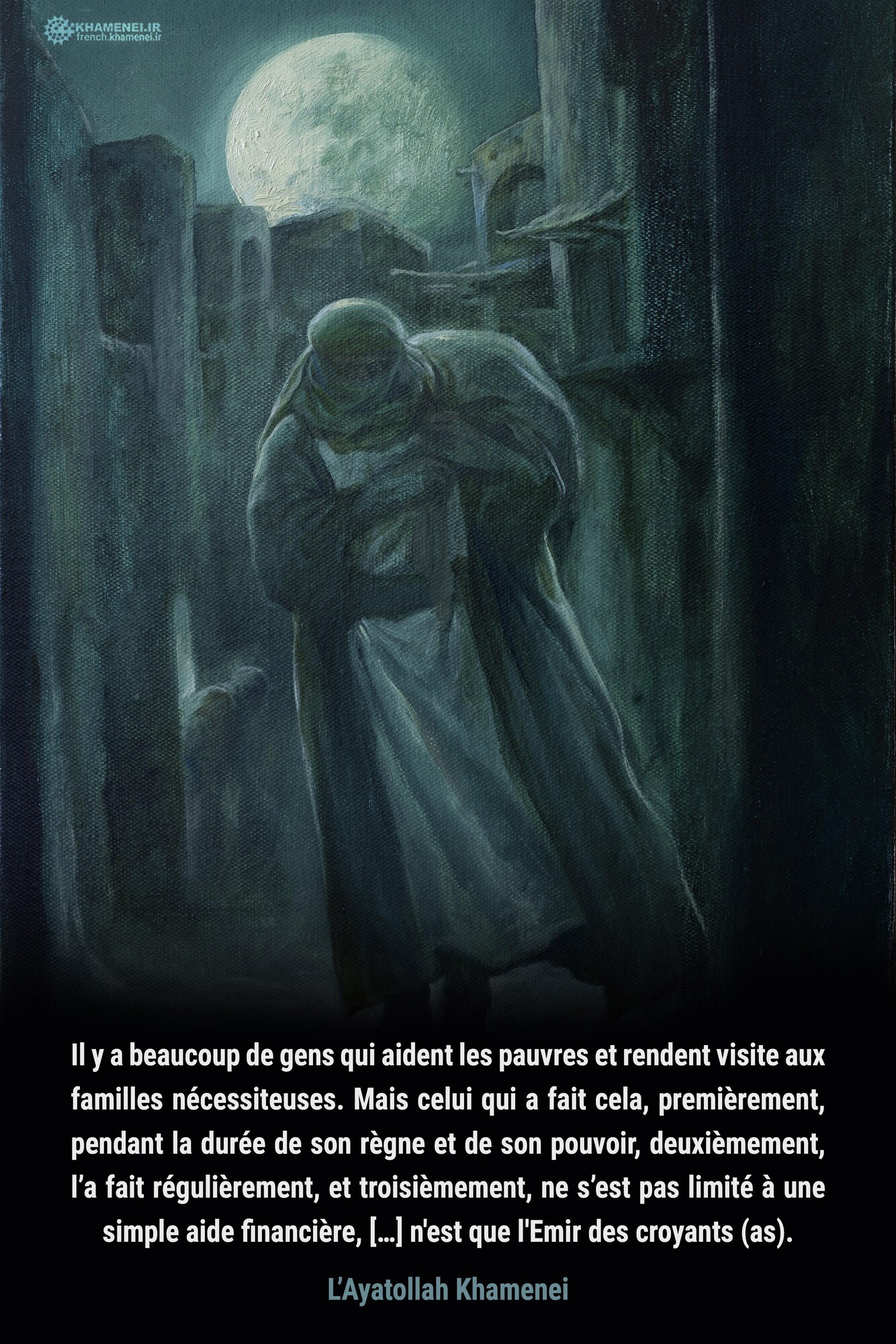 Il y a beaucoup de gens qui aident les pauvres et rendent visite aux familles nécessiteuses. Mais celui qui a fait cela, premièrement, pendant la durée de son règne et de son pouvoir, deuxièmement, l’a fait régulièrement, et troisièmement, ne s’est pas limité à une simple aide financière, […] n'est que l'Emir des croyants (as).