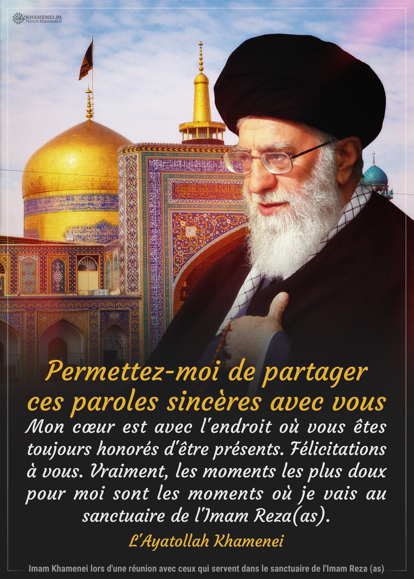 Mon cœur est avec l'endroit où vous êtes toujours honorés d'être présents. Félicitations à vous. Vraiment, les moments les plus doux pour moi sont les moments où je vais au sanctuaire de l'Imam Reza(as). Imam Khamenei lors d'une réunion avec ceux qui servent dans le sanctuaire de l'Imam Reza (as)