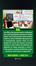 Les efforts des gouvernements occidentaux pour créer l'islamophobie produiront le résultat inverse. C'est-à-dire que leurs actions mettront l'islam au centre d’attention des jeunes qui se demanderaient pourquoi l’islam est tant attaqué de la part des réseaux de presse sionistes et des chaînes de télévision qui dépendent de cliques puissantes et riches ? Cette question a certaines bénédictions et peut transformer cette menace en opportunité. Imam Khamenei, 12 mars 2015