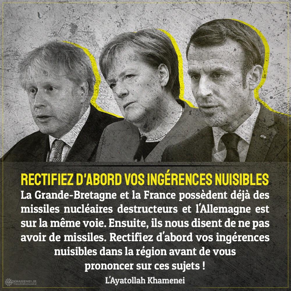 La Grande-Bretagne et la France possèdent déjà des missiles nucléaires destructeurs et l'Allemagne est sur la même voie. Ensuite, ils nous disent de ne pas avoir de missiles. Rectifiez d'abord vos ingérences nuisibles dans la région avant de vous prononcer sur ces sujets ! 24 novembre 2020