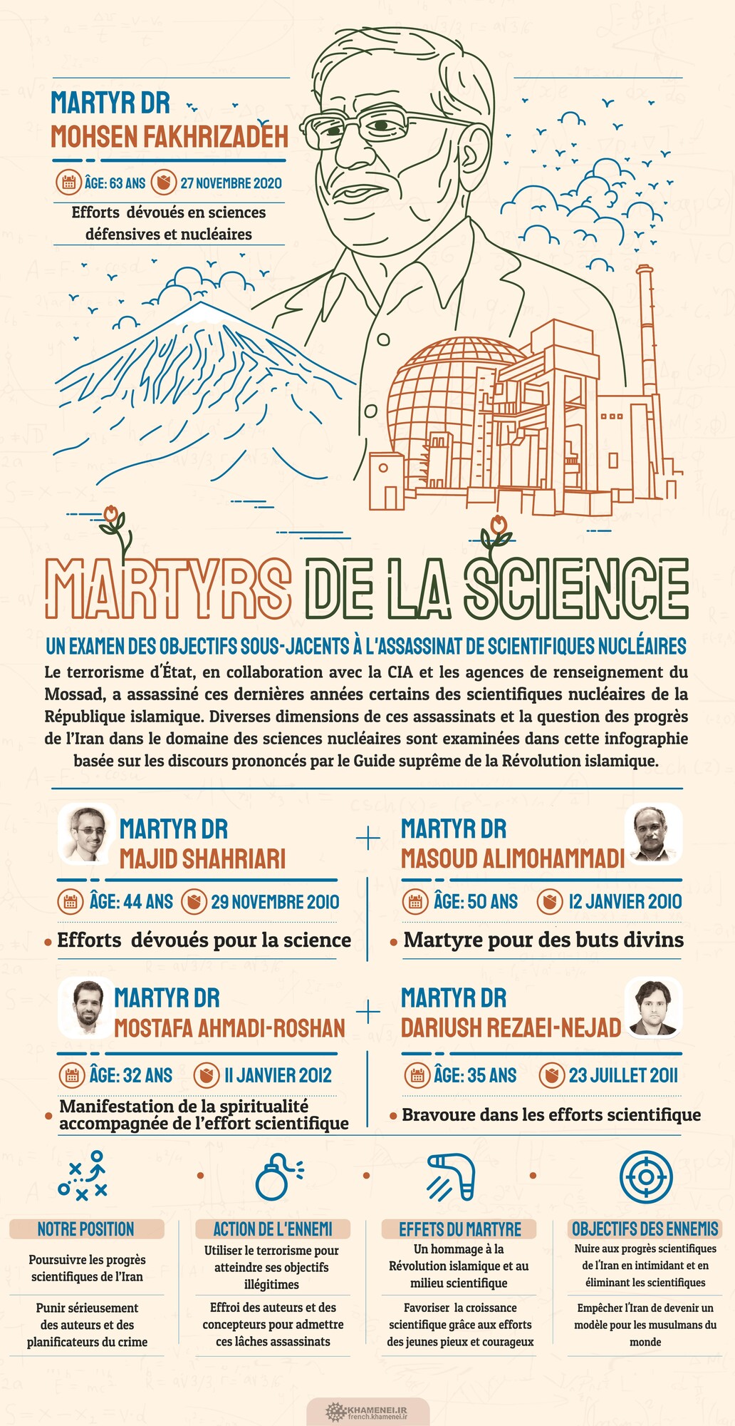Le terrorisme d'État, en collaboration avec la CIA et les agences de renseignement du Mossad, a assassiné ces dernières années certains des scientifiques nucléaires de la République islamique. Diverses dimensions de ces assassinats et la question des progrès de l’Iran dans le domaine des sciences nucléaires sont examinées dans cette infographie basée sur les discours prononcés par le Guide suprême de la Révolution islamique.