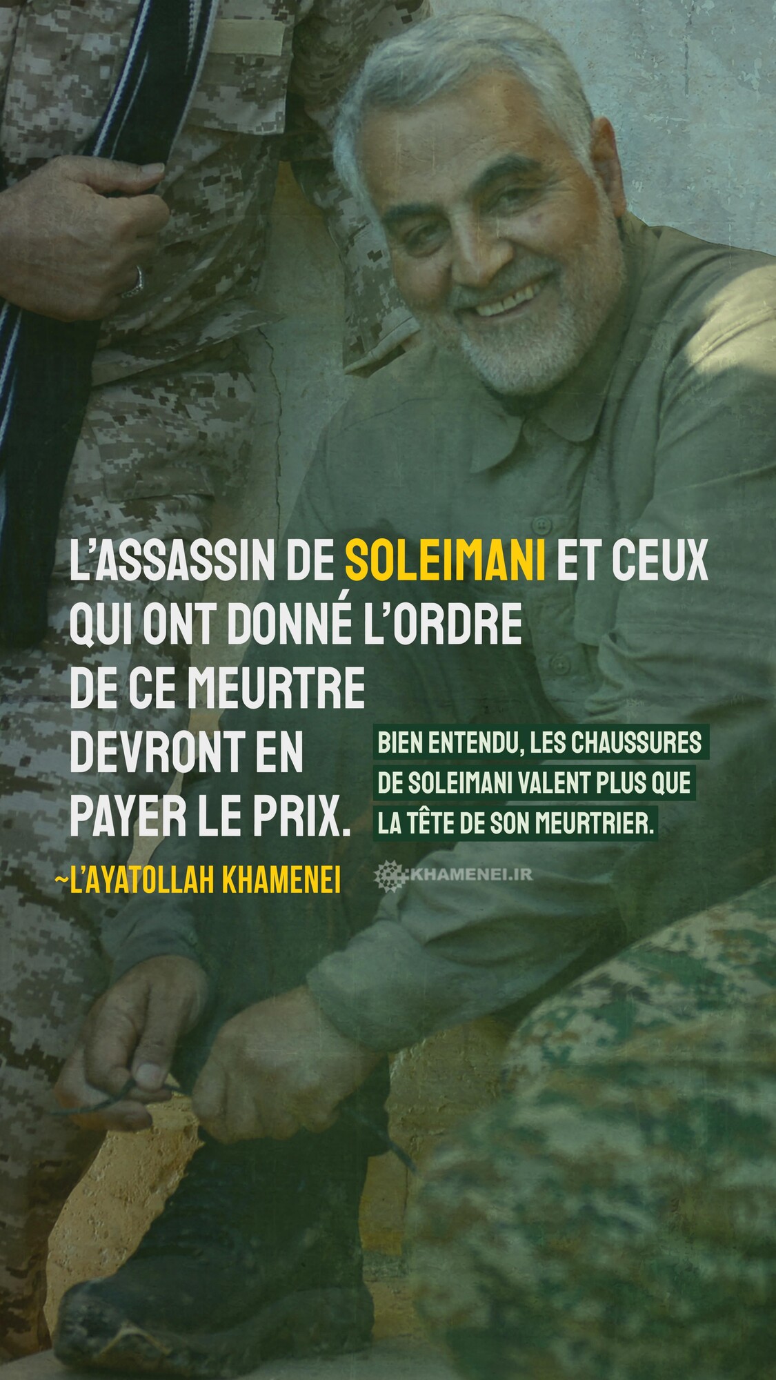 L’assassin de Soleimani et ceux qui ont donné l’ordre de ce meurtre devront en payer le prix. C'est une question à part qui a une place spéciale. Bien entendu, selon les mots d’une personnalité chère : « les chaussures de Soleimani valent plus que la tête de son meurtrier et même si son meurtrier perd sa tête, les chaussures de Soleimani auront toujours plus de valeur ». 16 décembre 2020