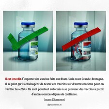 Il est interdit d'importer des vaccins faits aux Etats-Unis ou en Grande-Bretagne. Il se peut qu’ils envisagent de tester ces vaccins sur d’autres nations pour en vérifier les effets. Ils sont pourtant autorisés à se procurer des vaccins à partir d'autres sources dignes de confiance. Imam Khamenei 8 janvier 2021