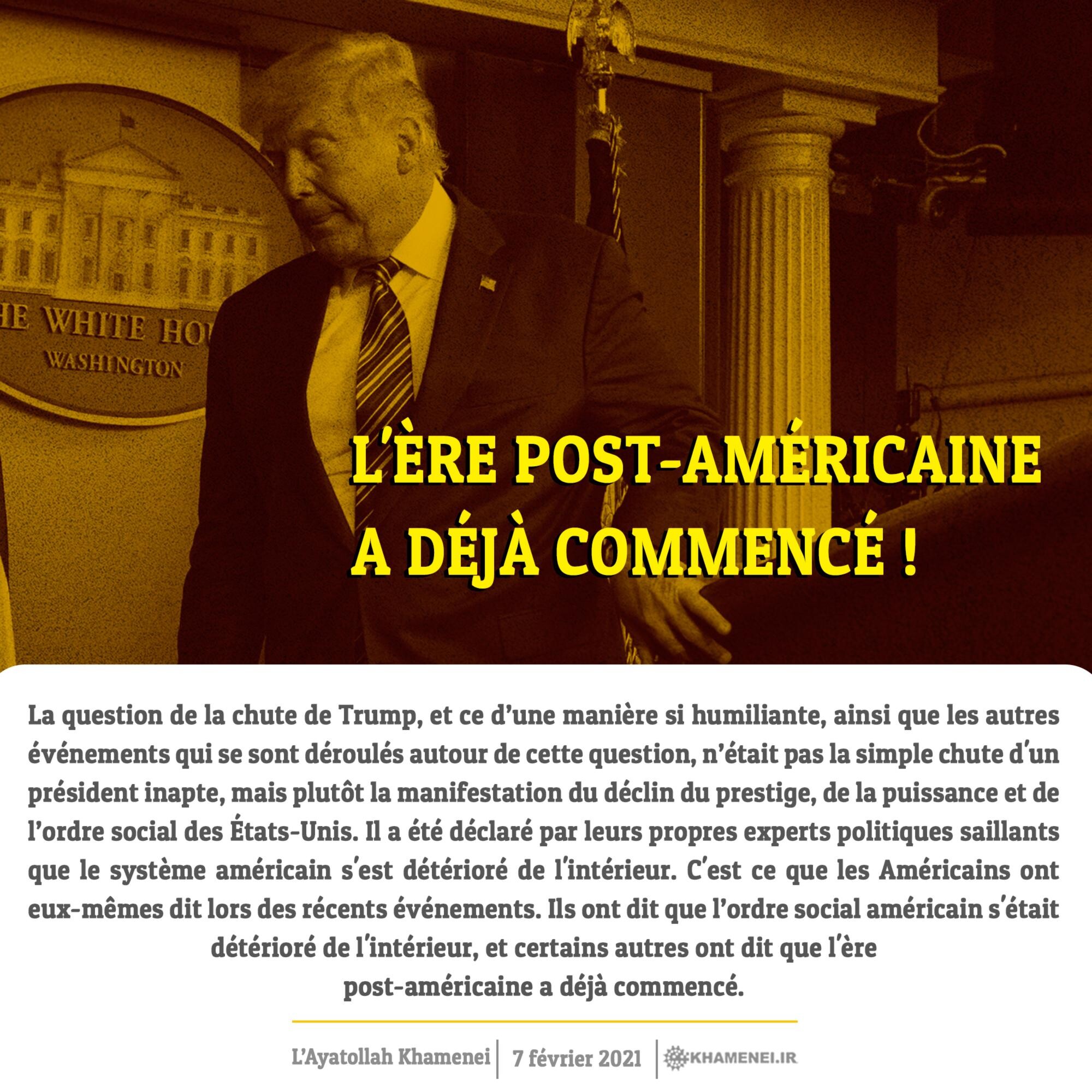 La question de la chute de Trump, et ce d’une manière si humiliante, ainsi que les autres événements qui se sont déroulés autour de cette question, n’était pas la simple chute d'un président inapte, mais plutôt la manifestation du déclin du prestige, de la puissance et de l’ordre social des États-Unis. Il a été déclaré par leurs propres experts politiques saillants que le système américain s'est détérioré de l'intérieur. C'est ce que les Américains ont eux-mêmes dit lors des récents événements. Ils ont dit que l’ordre social américain s'était détérioré de l'intérieur, et certains autres ont dit que l'ère post-américaine a déjà commencé. L’Ayatollah Khamenei 7 février 2021