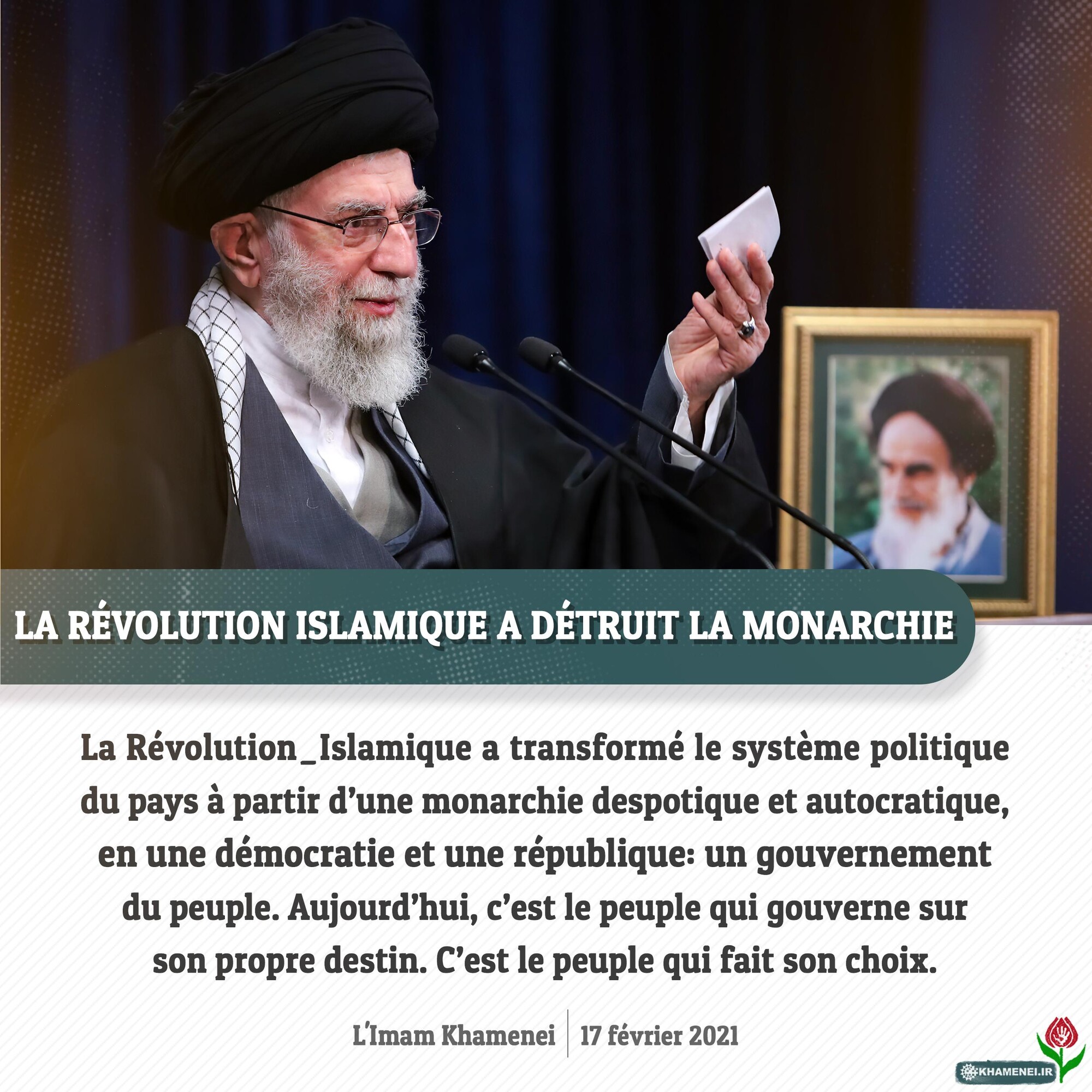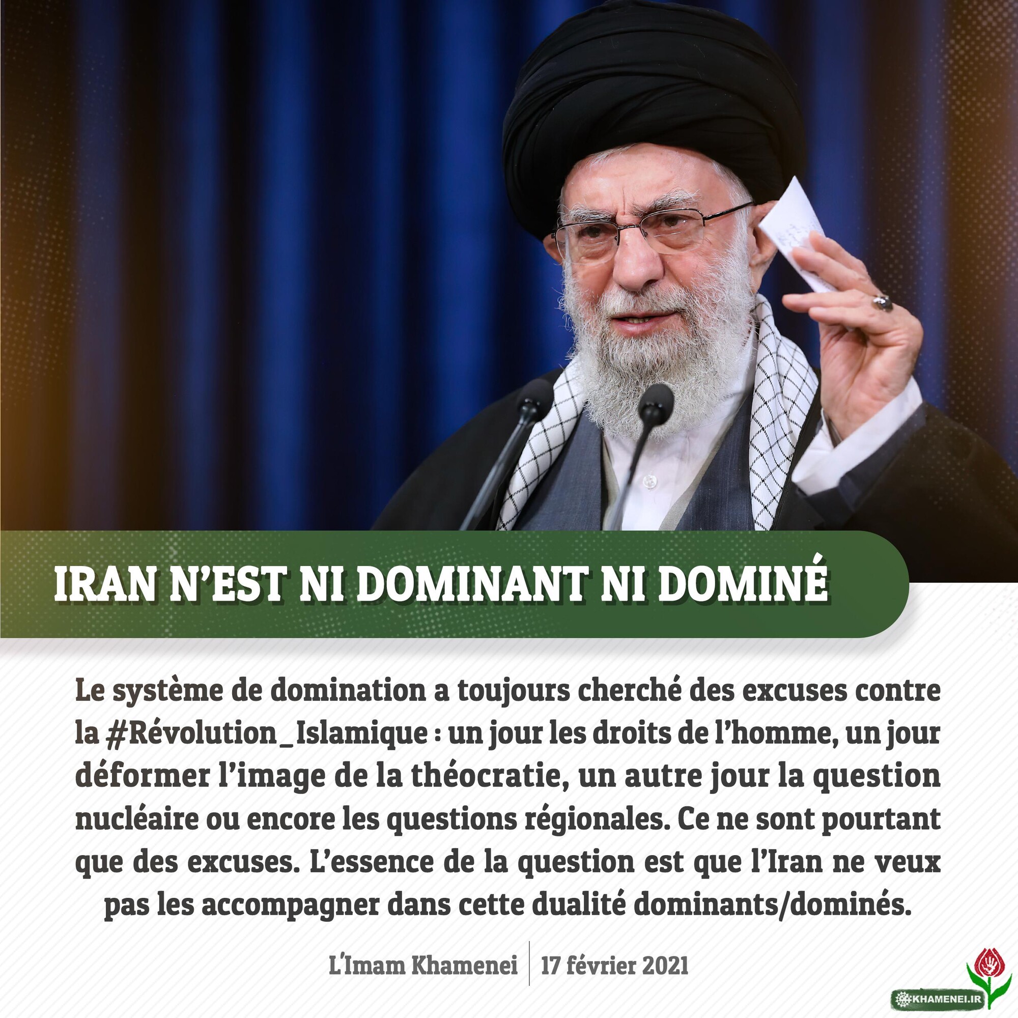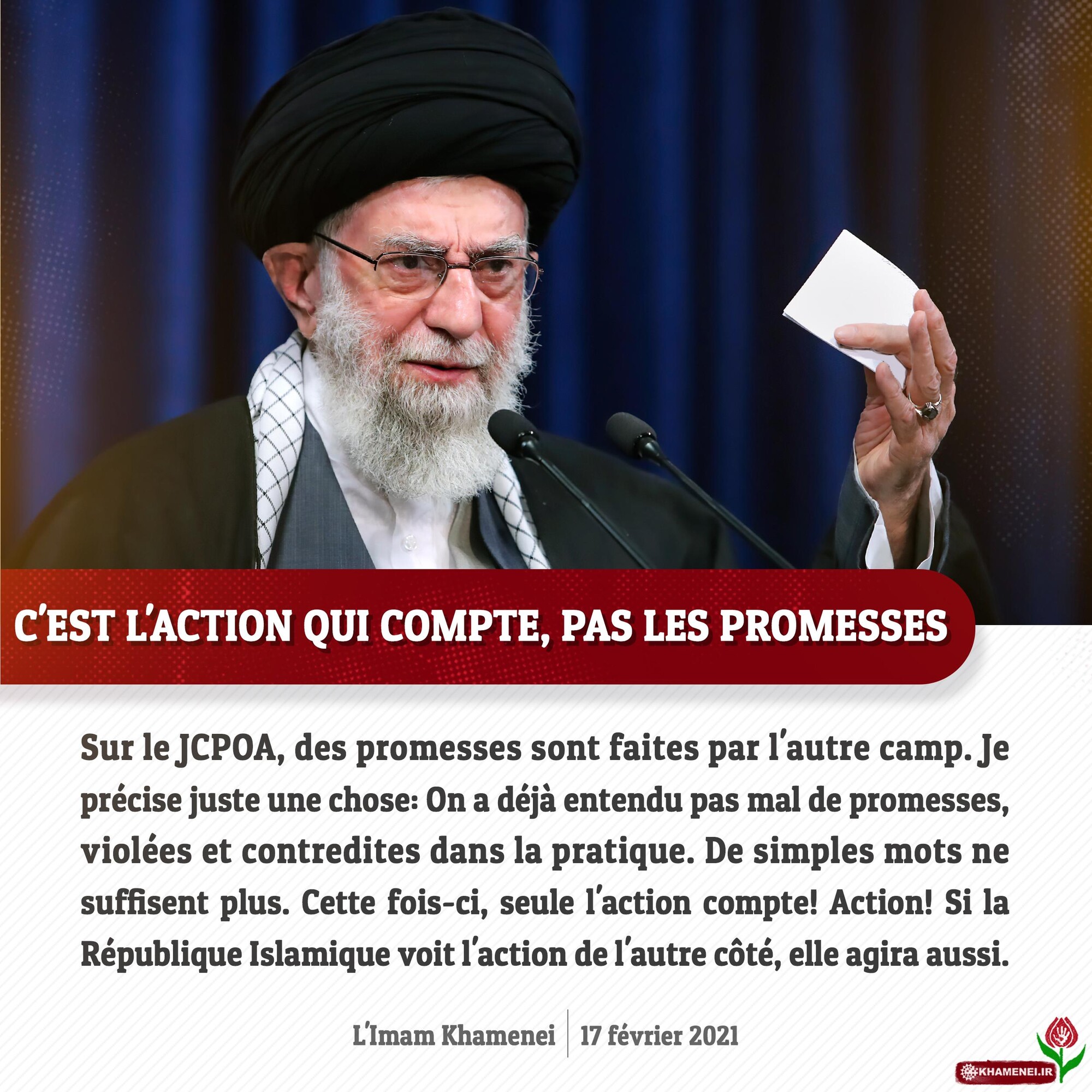 Sur le JCPOA, des promesses sont faites par l'autre camp. Je précise juste une chose: On a déjà entendu pas mal de promesses, violées et contredites dans la pratique. De simples mots ne suffisent plus. Cette fois-ci, seule l'action compte! Action! Si la République Islamique voit l'action de l'autre côté, elle agira aussi L'Imam Khamenei, 17 février 2021