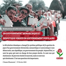 La Révolution islamique a changé [le système politique de] la gestion du pays d'un gouvernement dictatorial, monarchique et autocratique à une démocratie, une république, un gouvernement du peuple. Aujourd'hui, ce sont les gens qui sont en charge de leur propre destin. Ce sont eux qui choisissent. Ils peuvent choisir le mauvais, mais ce sont eux qui choisissent. C'est une question très importante. L’Imam Khamenei, 17 février 2021