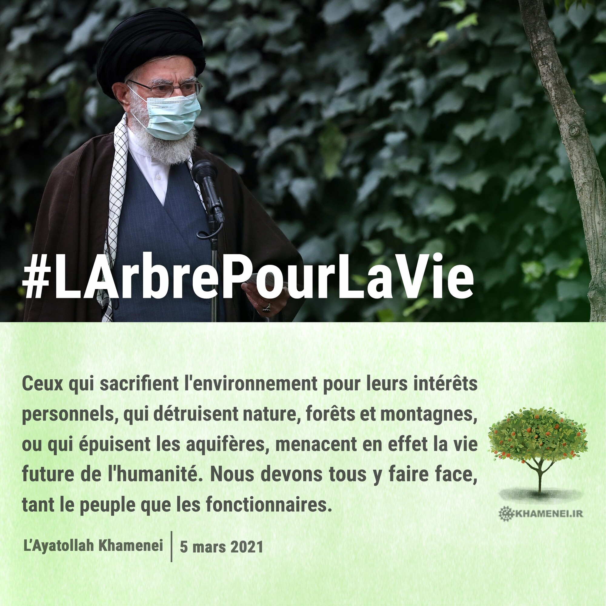 Ceux qui sacrifient l'environnement pour leurs intérêts personnels, qui détruisent nature, forêts et montagnes, ou qui épuisent les aquifères, menacent en effet la vie future de l'humanité. Nous devons tous y faire face, tant le peuple que les fonctionnaires. L’Imam Khamenei, 5 mars 2021