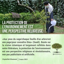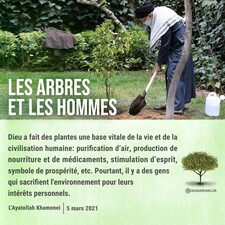 Ceux qui sacrifient l'environnement pour leurs intérêts personnels, qui détruisent nature, forêts et montagnes, ou qui épuisent les aquifères, menacent en effet la vie future de l'humanité. Nous devons tous y faire face, tant le peuple que les fonctionnaires. L’Imam Khamenei, 5 mars 2021