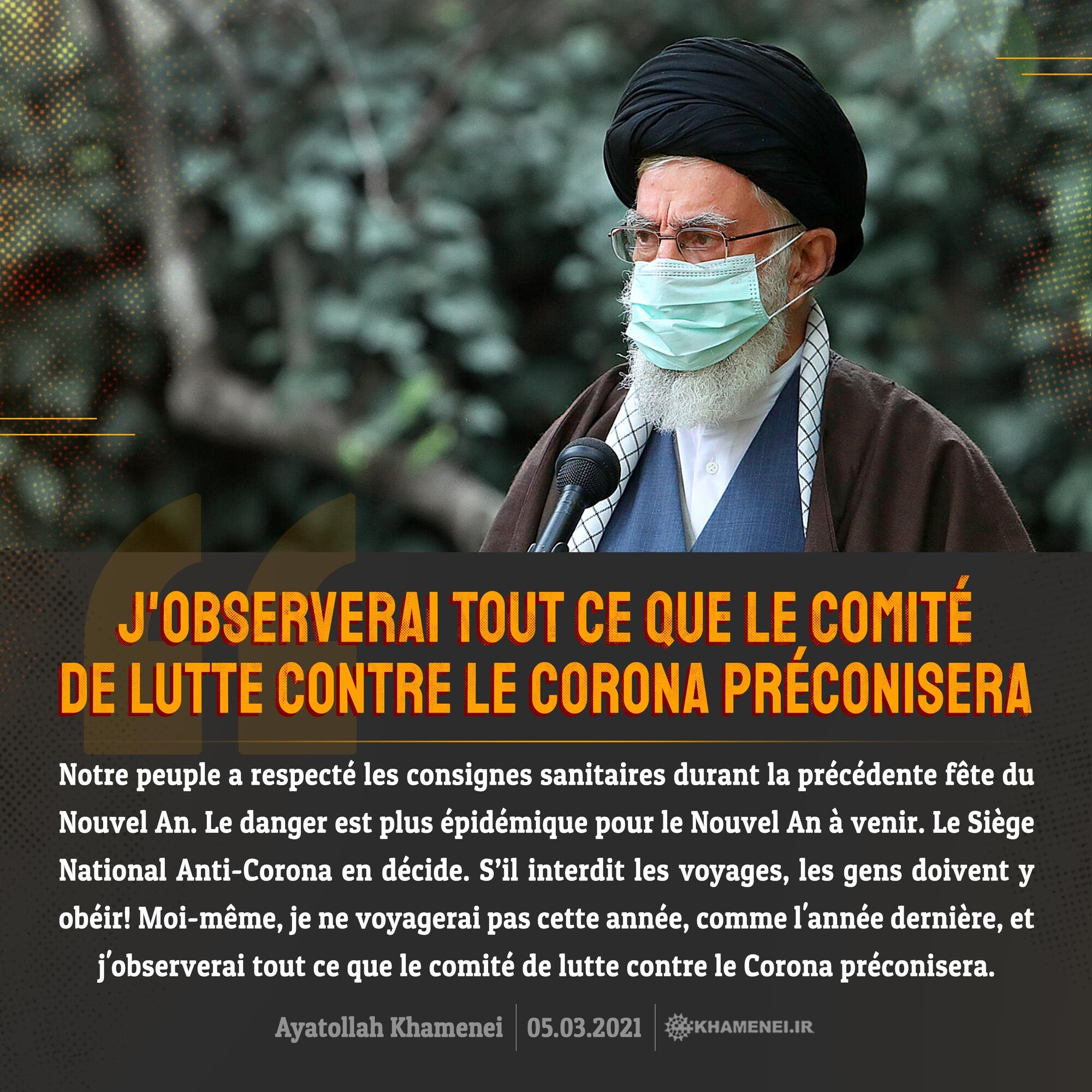 Notre peuple a respecté les consignes sanitaires durant la précédente fête du Nouvel An. Le danger est plus épidémique pour le Nouvel An à venir. Le Siège National Anti-Corona en décide. S’il interdit les voyages, les gens doivent y obéir! Moi-même, je ne voyagerai pas cette année, comme l'année dernière, et j'observerai tout ce que le comité de lutte contre le Corona préconisera. L’Imam Khamenei, 5 mars 2021