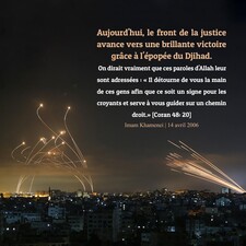 Aujourd'hui, le front de la justice avance vers une brillante victoire grâce à l'épopée du Djihad. On dirait vraiment que ces paroles d'Allah leur sont adressées : « Il détourne de vous la main de ces gens afin que ce soit un signe pour les croyants et serve à vous guider sur un chemin droit. » [Coran 48: 20] Imam Khamenei, 14 avril 2006