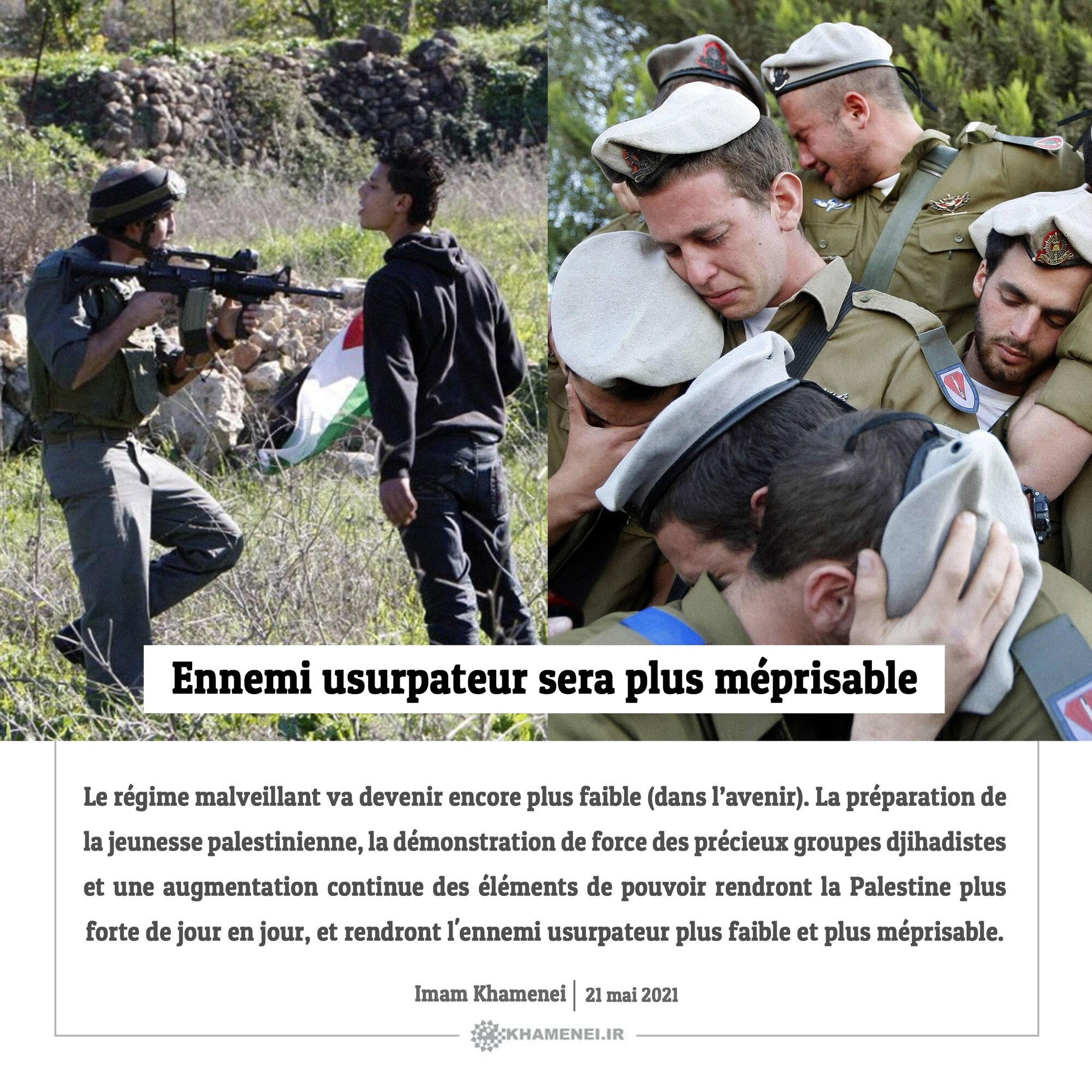 Le régime malveillant va devenir encore plus faible (dans l’avenir). La préparation de la jeunesse palestinienne, la démonstration de force des précieux groupes djihadistes et une augmentation continue des éléments de pouvoir rendront la Palestine plus forte de jour en jour, et rendront l'ennemi usurpateur plus faible et plus méprisable. Imam Khamenei, 21 mai 2021