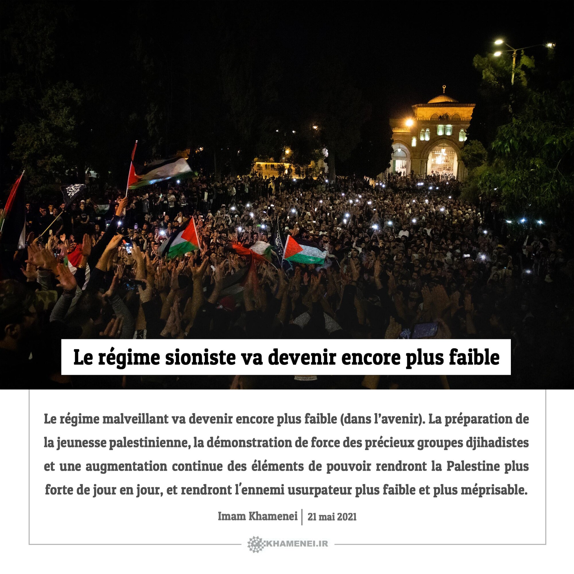 Le régime malveillant va devenir encore plus faible (dans l’avenir). La préparation de la jeunesse palestinienne, la démonstration de force des précieux groupes djihadistes et une augmentation continue des éléments de pouvoir rendront la Palestine plus forte de jour en jour, et rendront l'ennemi usurpateur plus faible et plus méprisable. Imam Khamenei, 21 mai 2021