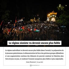 Le régime malveillant va devenir encore plus faible (dans l’avenir). La préparation de la jeunesse palestinienne, la démonstration de force des précieux groupes djihadistes et une augmentation continue des éléments de pouvoir rendront la Palestine plus forte de jour en jour, et rendront l'ennemi usurpateur plus faible et plus méprisable. Imam Khamenei, 21 mai 2021