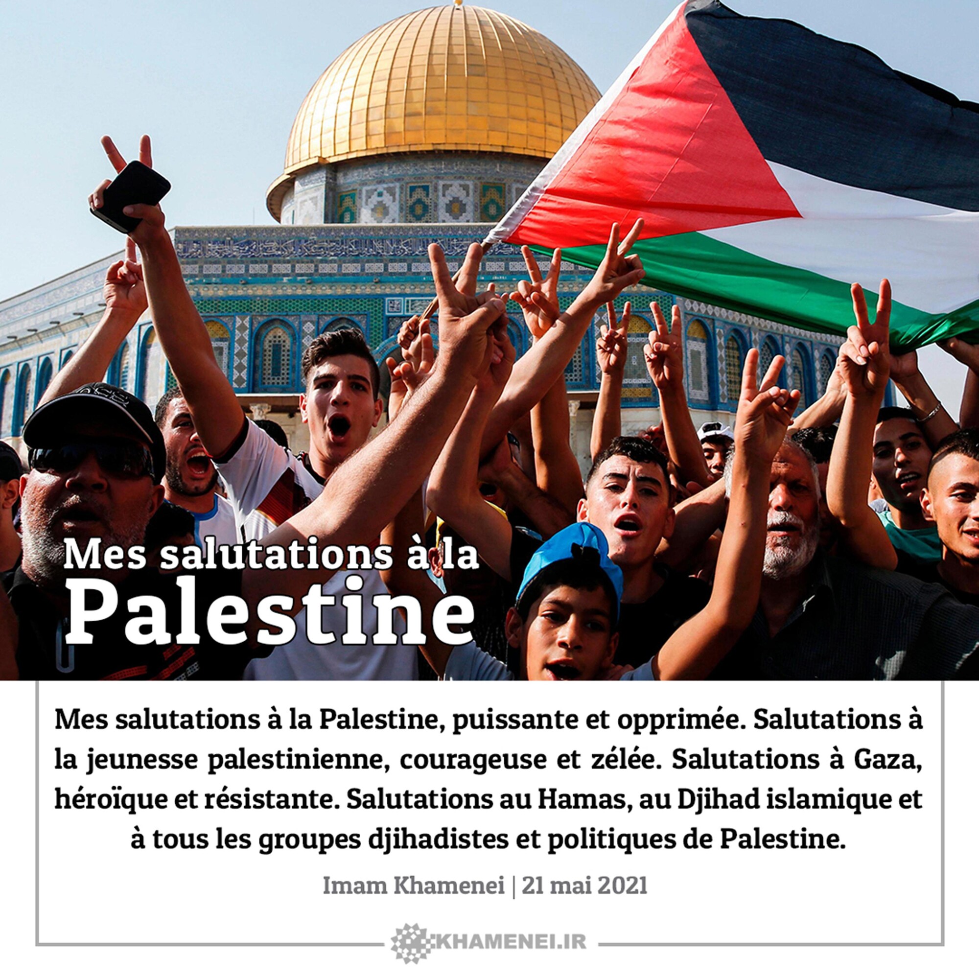 Mes salutations à la Palestine, puissante et opprimée. Salutations à la jeunesse palestinienne, courageuse et zélée. Salutations à Gaza, héroïque et résistante. Salutations au Hamas, au Djihad islamique et à tous les groupes djihadistes et politiques de Palestine. Imam Khamenei, 21 mai 2021