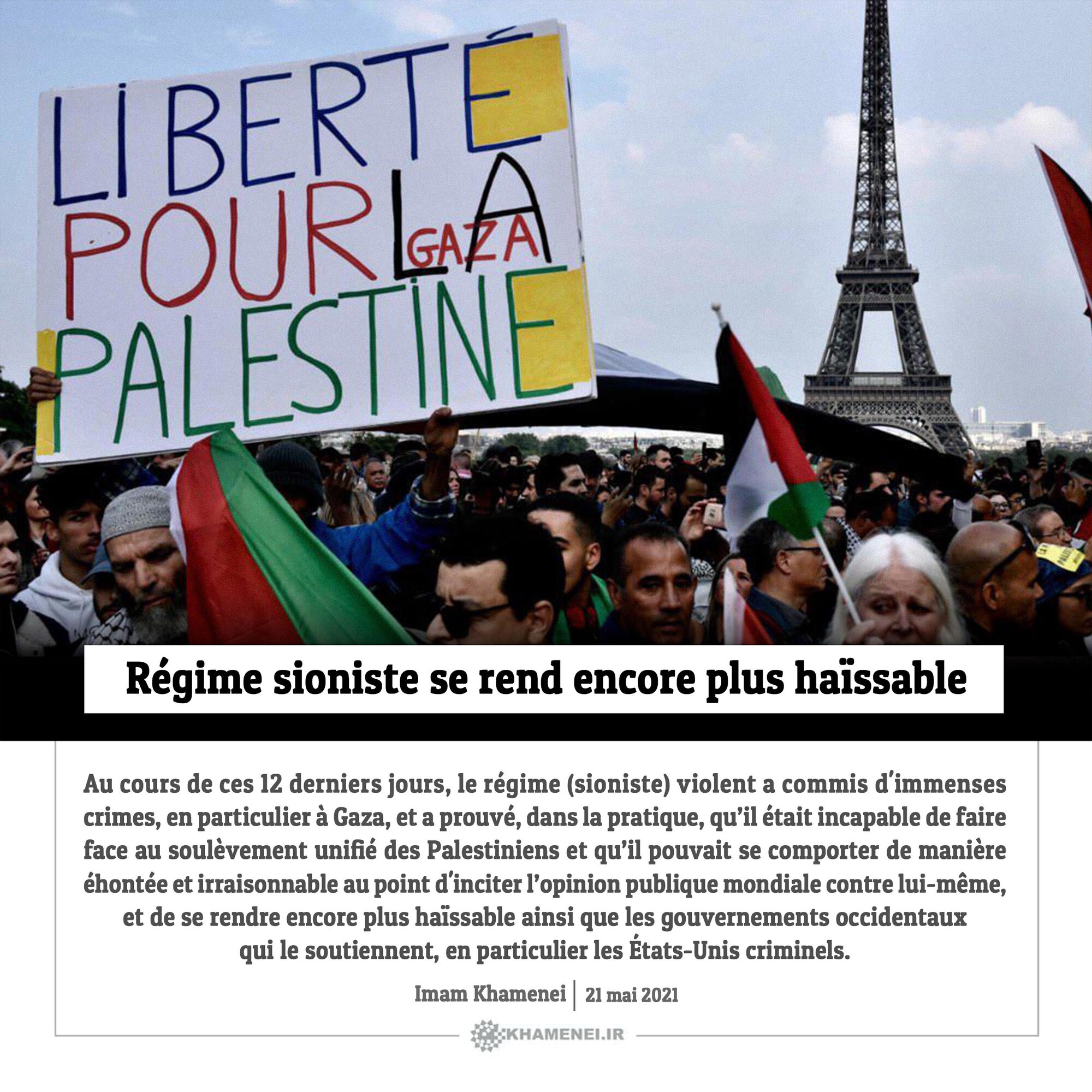Au cours de ces 12 derniers jours, le régime (sioniste) violent a commis d'immenses crimes, en particulier à Gaza, et a prouvé, dans la pratique, qu’il était incapable de faire face au soulèvement unifié des Palestiniens et qu’il pouvait se comporter de manière éhontée et irraisonnable au point d'inciter l’opinion publique mondiale contre lui-même, et de se rendre encore plus haïssable ainsi que les gouvernements occidentaux qui le soutiennent, en particulier les États-Unis criminels. Imam Khamenei, 21 mai 2021