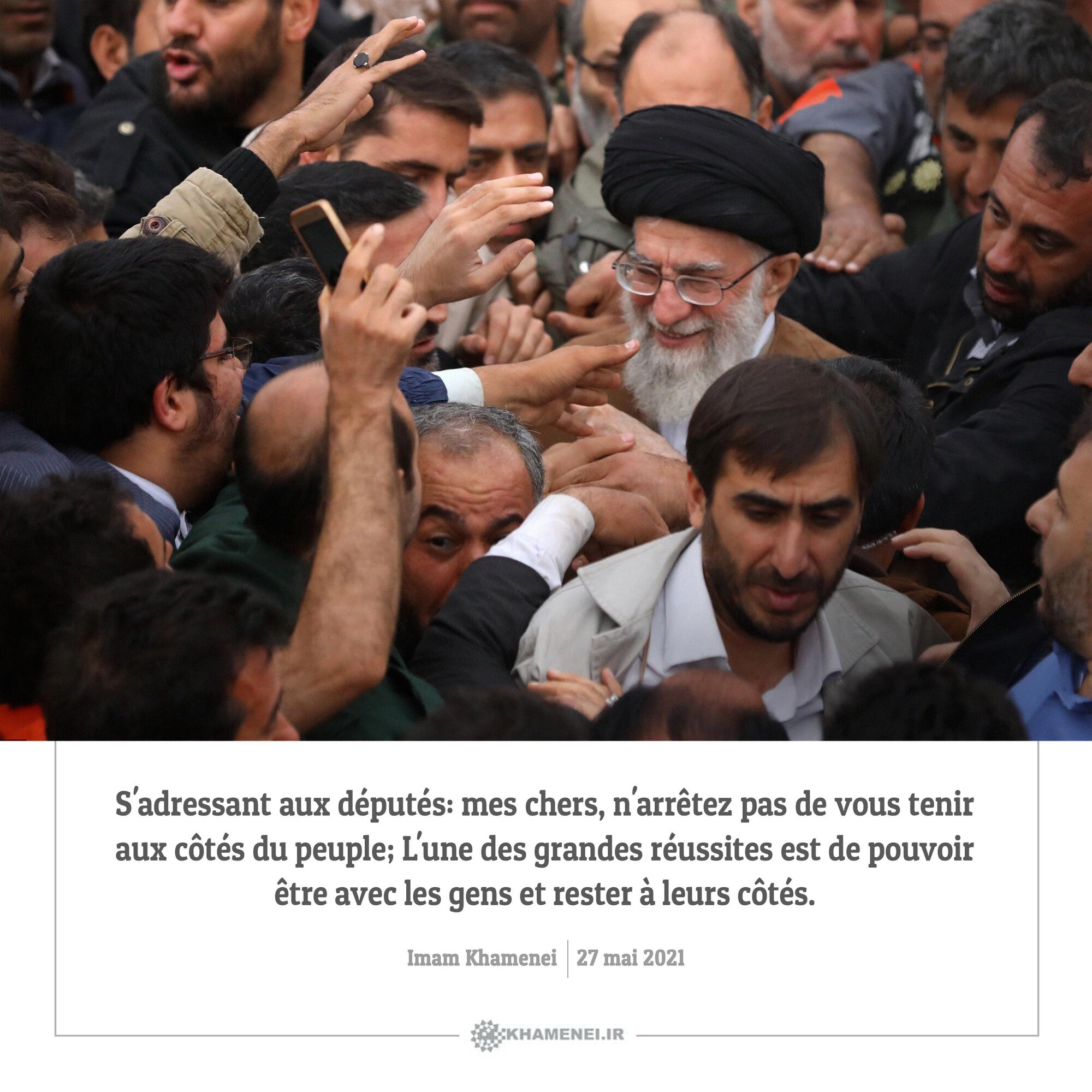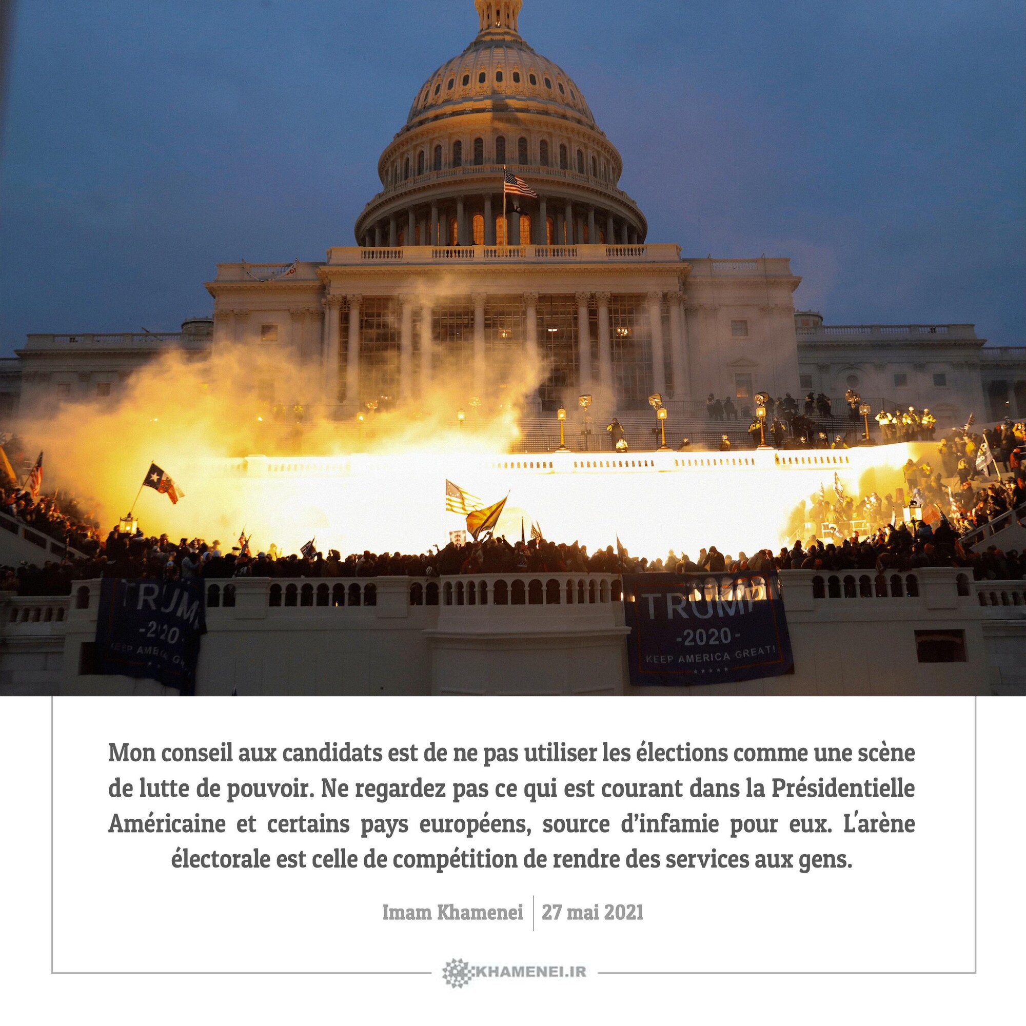 Mon conseil aux candidats est de ne pas utiliser les élections comme une scène de lutte de pouvoir. Ne regardez pas ce qui est courant dans la Présidentielle Américaine et certains pays européens, source d’infamie pour eux. L'arène électorale est celle de compétition de rendre des services aux gens. Imam Khamenei, 27 mai 2021