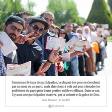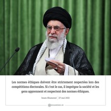 Mon conseil aux candidats est de ne pas utiliser les élections comme une scène de lutte de pouvoir. Ne regardez pas ce qui est courant dans la Présidentielle Américaine et certains pays européens, source d’infamie pour eux. L'arène électorale est celle de compétition de rendre des services aux gens. Imam Khamenei, 27 mai 2021