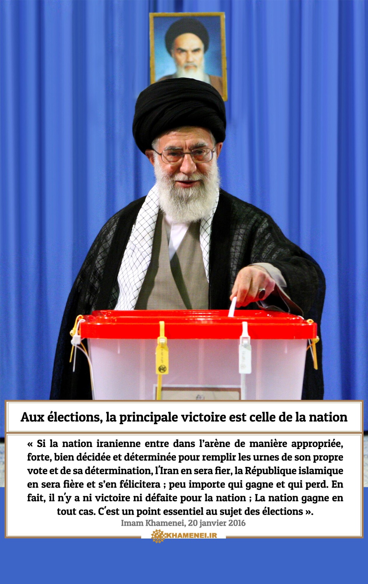 « Si la nation iranienne entre dans l’arène de manière appropriée, forte, bien décidée et déterminée pour remplir les urnes de son propre vote et de sa détermination, l'Iran en sera fier, la République islamique en sera fière et s’en félicitera ; peu importe qui gagne et qui perd. En fait, il n'y a ni victoire ni défaite pour la nation ; La nation gagne en tout cas. C'est un point essentiel au sujet des élections ». Imam Khamenei, 20 janvier 2016
