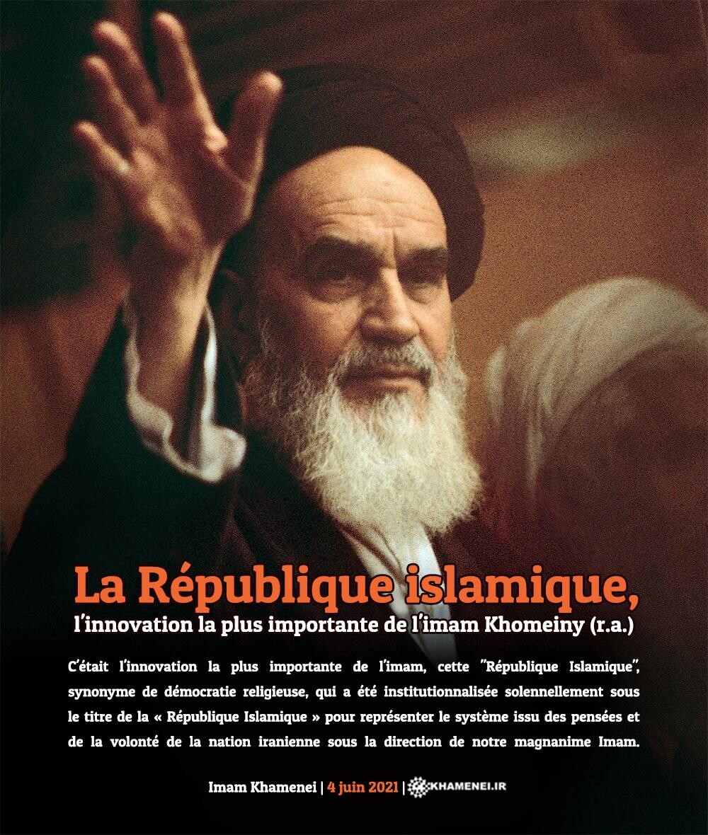 C'était l'innovation la plus importante de l'imam, cette "République Islamique", synonyme de démocratie religieuse, qui a été institutionnalisée solennellement sous le titre de la « République Islamique » pour représenter le système issu des pensées et de la volonté de la nation iranienne sous la direction de notre magnanime Imam. Imam Khamenei 4 juin 2021