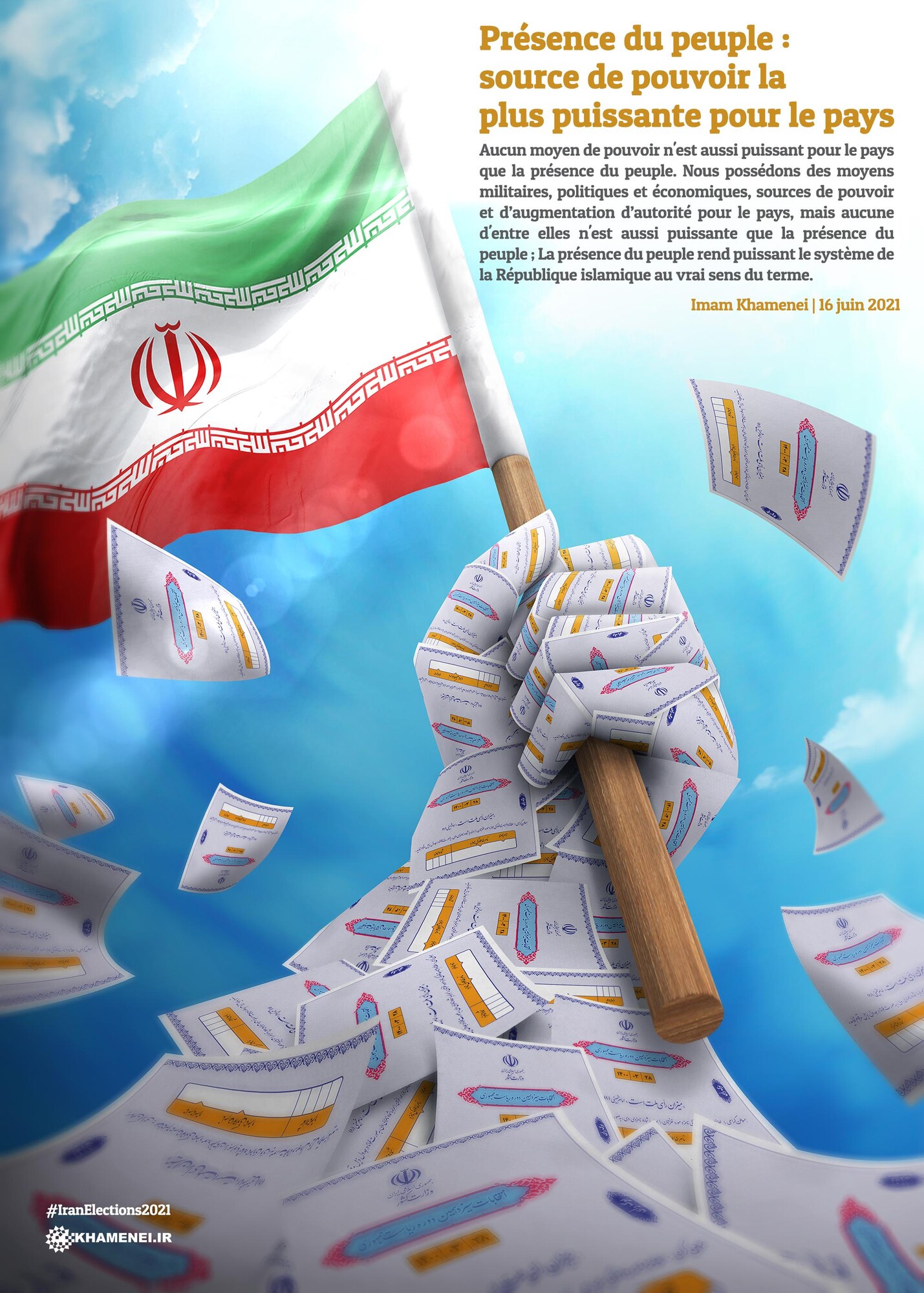 Aucun moyen de pouvoir n'est aussi puissant pour le pays que la présence du peuple. Nous possédons des moyens militaires, politiques et économiques, sources de pouvoir et d’augmentation d’autorité pour le pays, mais aucune d'entre elles n'est aussi puissante que la présence du peuple ; La présence du peuple rend puissant le système de la République islamique au vrai sens du terme. Imam Khamenei, 16 juin 2021