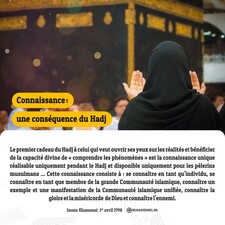 Le premier cadeau du Hadj à celui qui veut ouvrir ses yeux sur les réalités et bénéficier de la capacité divine de « comprendre les phénomènes » est la connaissance unique réalisable uniquement pendant le Hadj et disponible uniquement pour les pèlerins musulmans … Cette connaissance consiste à : se connaître en tant qu'individu, se connaître en tant que membre de la grande Communauté islamique, connaître un exemple et une manifestation de la Communauté islamique unifiée, connaître la gloire et la miséricorde de Dieu et connaître l'ennemi. Imam Khamenei, 1er avril 1998
