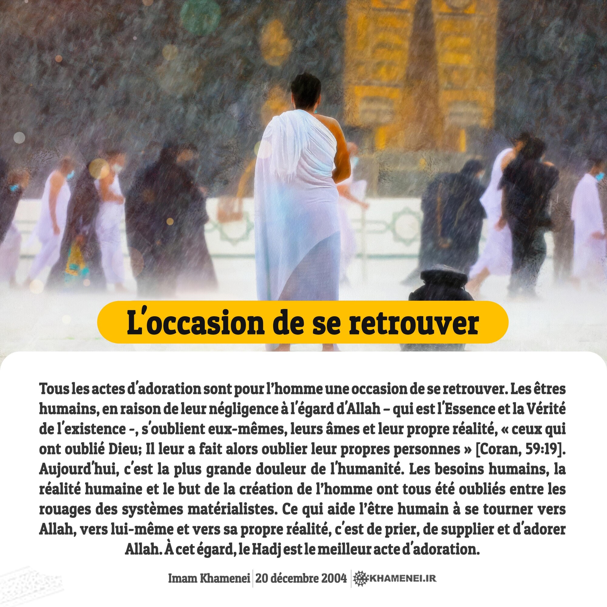 Tous les actes d'adoration sont pour l’homme une occasion de se retrouver. Les êtres humains, en raison de leur négligence à l'égard d'Allah – qui est l'Essence et la Vérité de l'existence -, s'oublient eux-mêmes, leurs âmes et leur propre réalité, « ceux qui ont oublié Dieu; Il leur a fait alors oublier leur propres personnes » [Coran, 59:19]. Aujourd'hui, c'est la plus grande douleur de l'humanité. Les besoins humains, la réalité humaine et le but de la création de l’homme ont tous été oubliés entre les rouages des systèmes matérialistes. Ce qui aide l’être humain à se tourner vers Allah, vers lui-même et vers sa propre réalité, c'est de prier, de supplier et d'adorer Allah. À cet égard, le Hadj est le meilleur acte d'adoration. Imam Khamenei, 20 décembre 2004