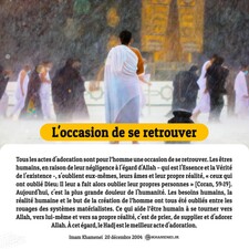 Tous les actes d'adoration sont pour l’homme une occasion de se retrouver. Les êtres humains, en raison de leur négligence à l'égard d'Allah – qui est l'Essence et la Vérité de l'existence -, s'oublient eux-mêmes, leurs âmes et leur propre réalité, « ceux qui ont oublié Dieu; Il leur a fait alors oublier leur propres personnes » [Coran, 59:19]. Aujourd'hui, c'est la plus grande douleur de l'humanité. Les besoins humains, la réalité humaine et le but de la création de l’homme ont tous été oubliés entre les rouages des systèmes matérialistes. Ce qui aide l’être humain à se tourner vers Allah, vers lui-même et vers sa propre réalité, c'est de prier, de supplier et d'adorer Allah. À cet égard, le Hadj est le meilleur acte d'adoration. Imam Khamenei, 20 décembre 2004