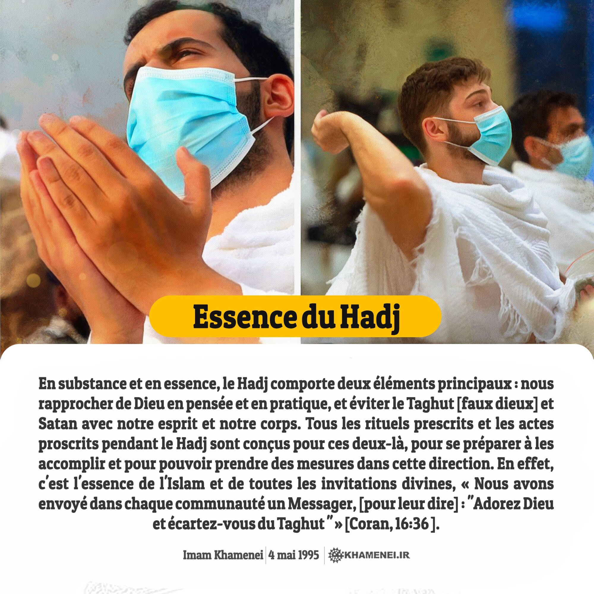 En substance et en essence, le Hadj comporte deux éléments principaux : nous rapprocher de Dieu en pensée et en pratique, et éviter le Taghut [faux dieux] et Satan avec notre esprit et notre corps. Tous les rituels prescrits et les actes proscrits pendant le Hadj sont conçus pour ces deux-là, pour se préparer à les accomplir et pour pouvoir prendre des mesures dans cette direction. En effet, c'est l'essence de l'Islam et de toutes les invitations divines, « Nous avons envoyé dans chaque communauté un Messager, [pour leur dire] : "Adorez Dieu et écartez-vous du Taghut " » [Coran, 16:36 ]. Imam Khamenei, 4 mai 1995