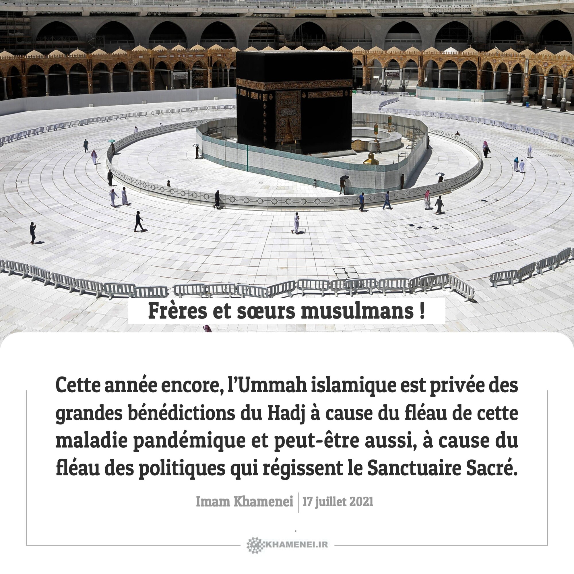 Cette année encore, l’Ummah islamique est privée des grandes bénédictions du Hadj à cause du fléau de cette maladie pandémique et peut-être aussi, à cause du fléau des politiques qui régissent le Sanctuaire Sacré. Imam Khamenei, 17 juillet 2021