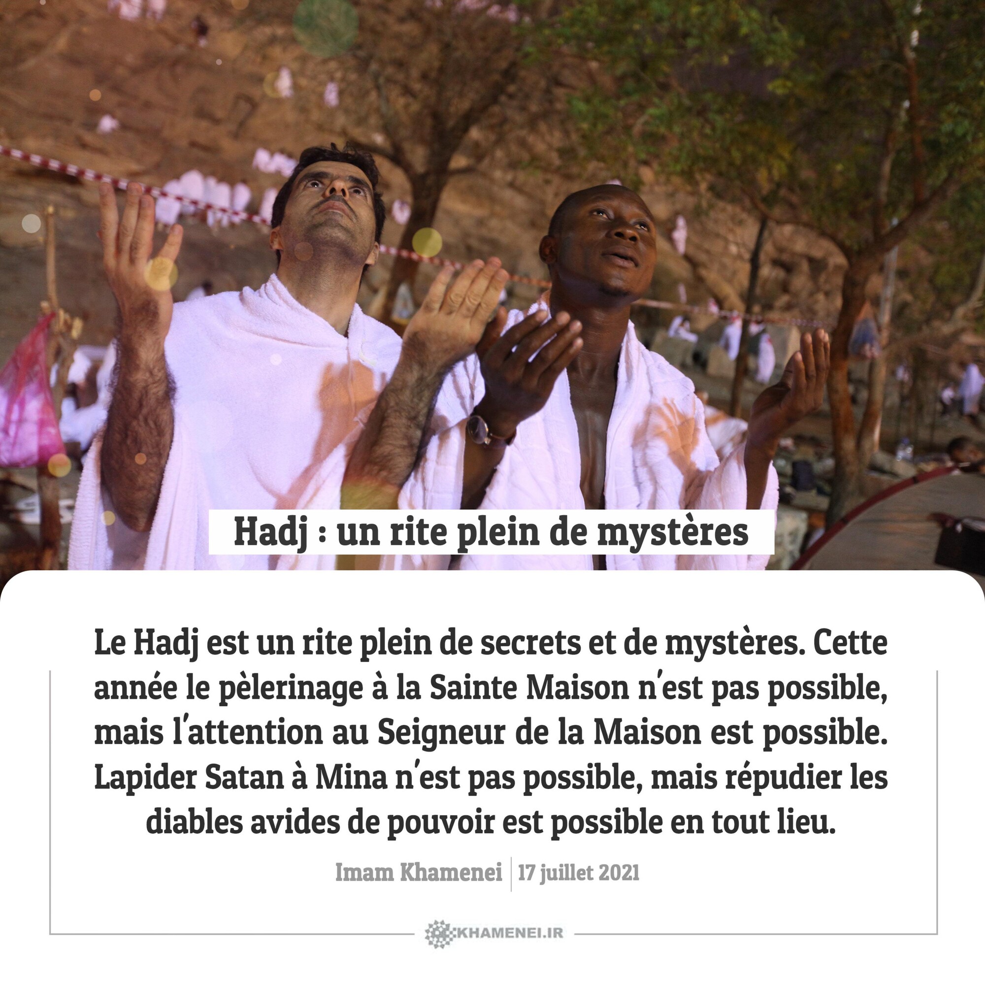 Le Hadj est un rite plein de secrets et de mystères. Cette année le pèlerinage à la Sainte Maison n'est pas possible, mais l'attention au Seigneur de la Maison est possible. Lapider Satan à Mina n'est pas possible, mais répudier les diables avides de pouvoir est possible en tout lieu. Imam Khamenei, 17 juillet 2021
