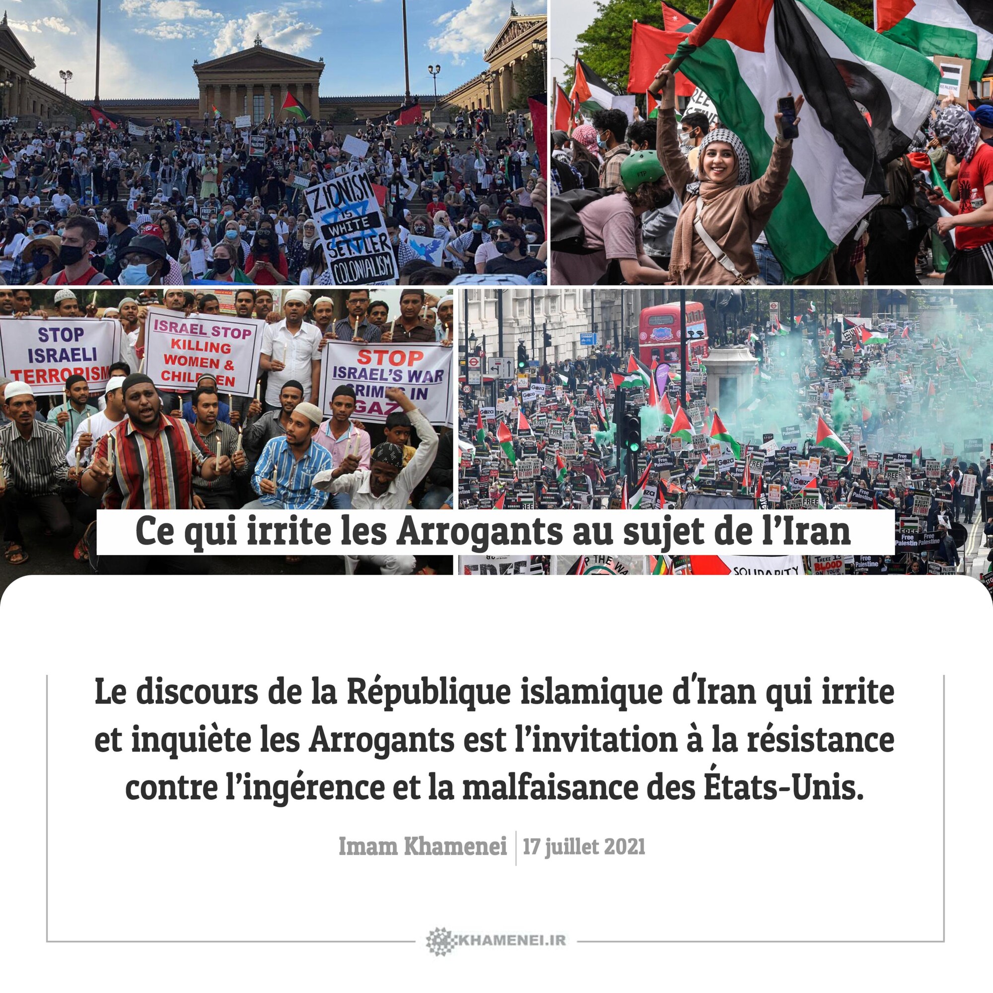 Le discours de la République islamique d'Iran qui irrite et inquiète les Arrogants est l’invitation à la résistance contre l’ingérence et la malfaisance des États-Unis. Imam Khamenei, 17 juillet 2021