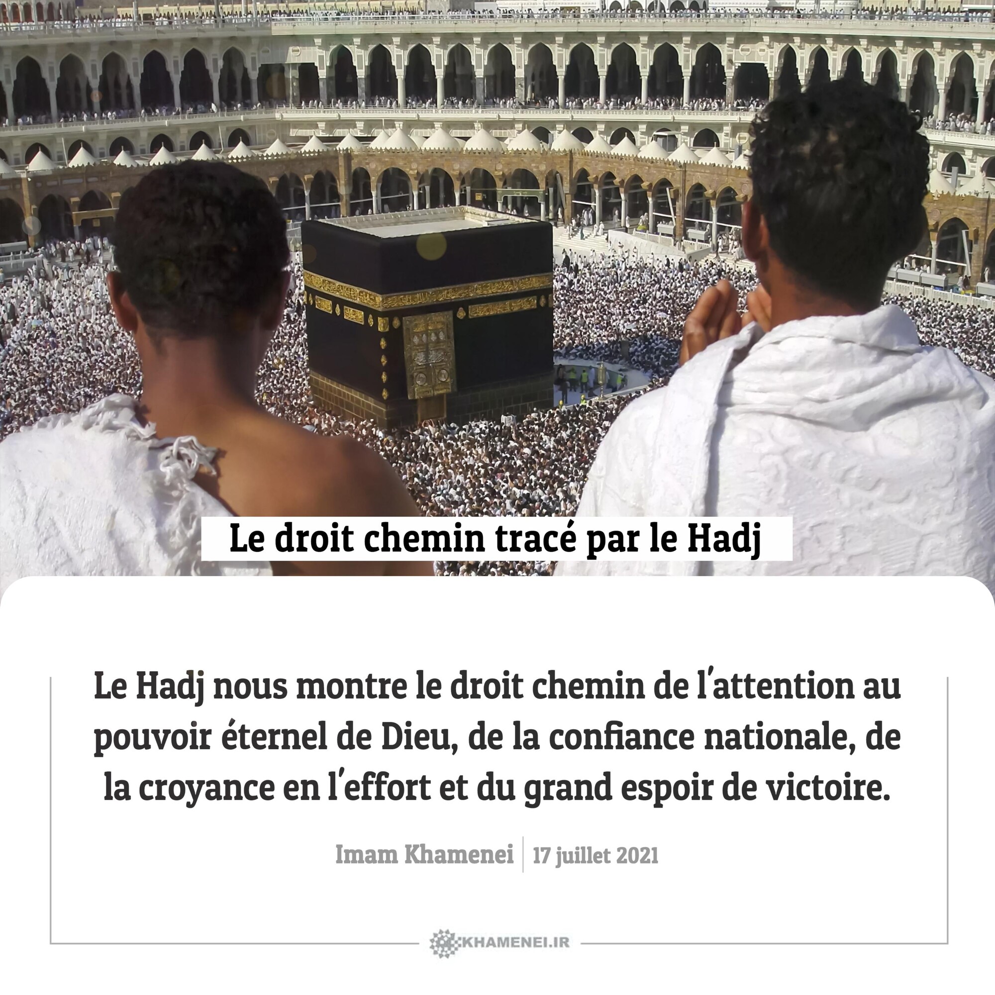 Le Hadj nous montre le droit chemin de l'attention au pouvoir éternel de Dieu, de la confiance nationale, de la croyance en l'effort et du grand espoir de victoire. Imam Khamenei, 17 juillet 2021