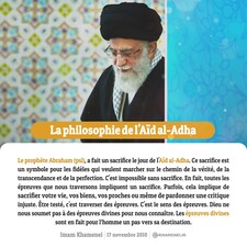 Le prophète Abraham (psl), a fait un sacrifice le jour de l'Aïd al-Adha. Ce sacrifice est un symbole pour les fidèles qui veulent marcher sur le chemin de la vérité, de la transcendance et de la perfection. C'est impossible sans sacrifice. En fait, toutes les épreuves que nous traversons impliquent un sacrifice. Parfois, cela implique de sacrifier votre vie, vos biens, vos proches ou même de pardonner une critique injuste. Être testé, c'est traverser des épreuves. C'est le sens des épreuves. Dieu ne nous soumet pas à des épreuves divines pour nous connaître. Les épreuves divines sont en fait pour l’homme un pas vers sa destination. Imam Khamenei 17 novembre 2010