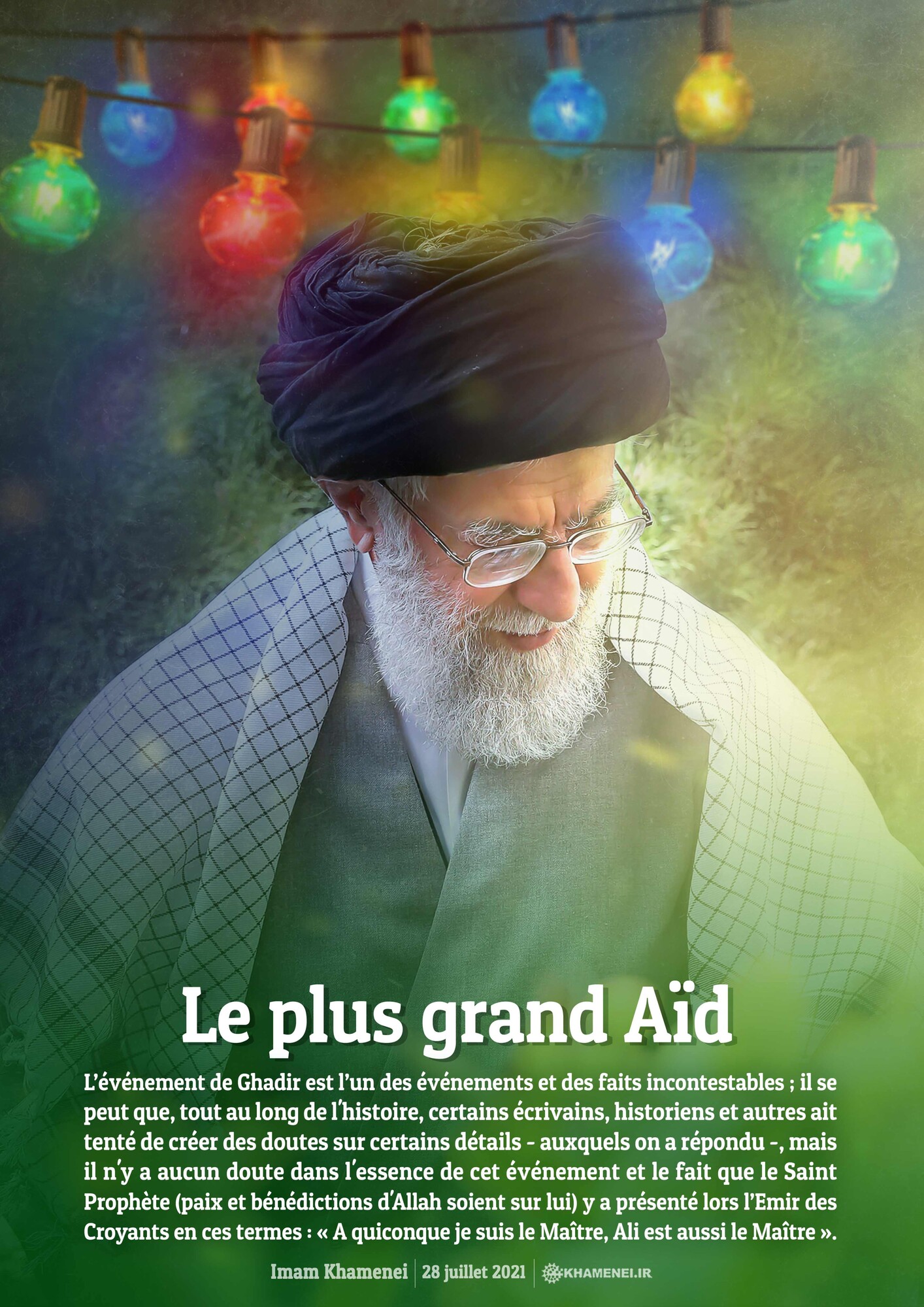 L’événement de Ghadir est l’un des événements et des faits incontestables ; il se peut que, tout au long de l'histoire, certains écrivains, historiens et autres ait tenté de créer des doutes sur certains détails - auxquels on a répondu -, mais il n'y a aucun doute dans l'essence de cet événement et le fait que le Saint Prophète (paix et bénédictions d'Allah soient sur lui) y a présenté lors l’Emir des Croyants en ces termes : « A quiconque je suis le Maître, Ali est aussi le Maître ». Imam Khamenei, 28 juillet 2021
