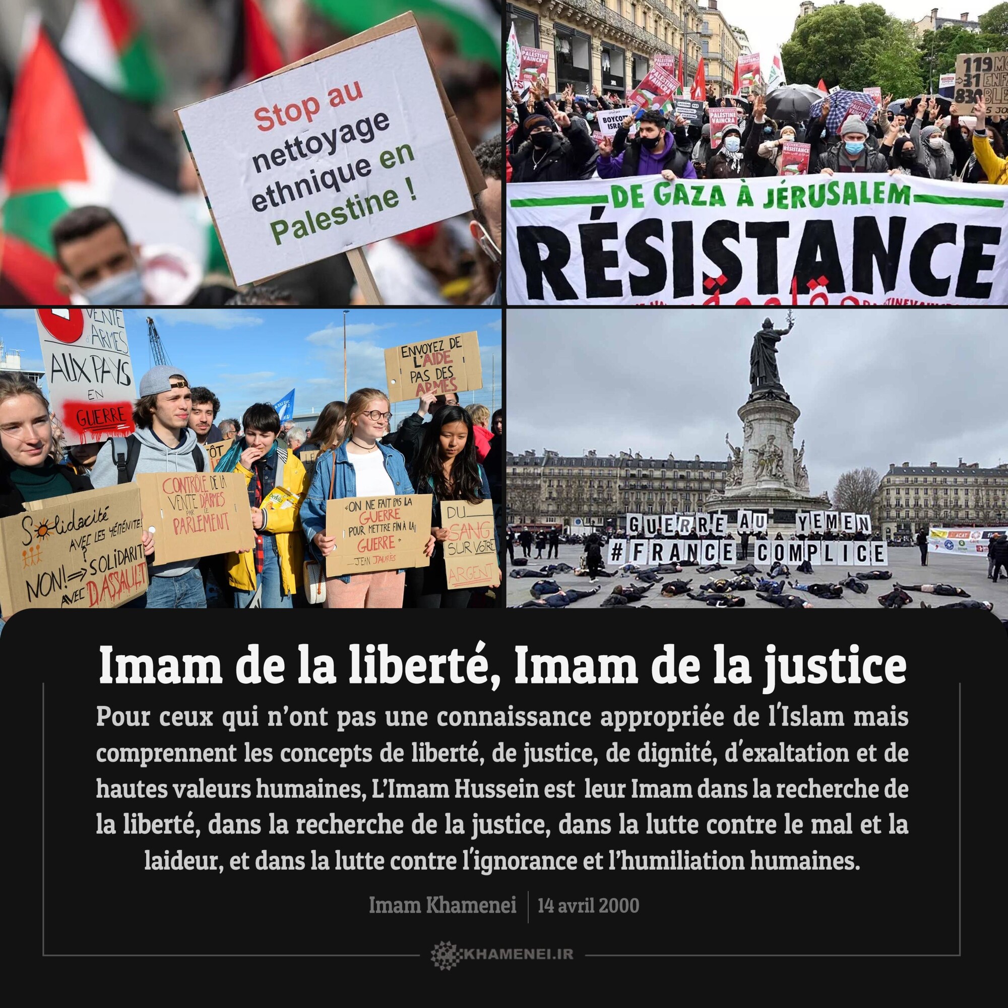 Pour ceux qui n’ont pas une connaissance appropriée de l'Islam mais comprennent les concepts de liberté, de justice, de dignité, d'exaltation et de hautes valeurs humaines, L’Imam Hussein est leur Imam dans la recherche de la liberté, dans la recherche de la justice, dans la lutte contre le mal et la laideur, et dans la lutte contre l'ignorance et l’humiliation humaines. Imam Khamenei, 14 avril 2000