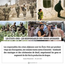 Les responsables des crises afghanes sont les États-Unis qui pendant vingt ans d'occupation, ont commis toutes sortes d'atrocités - bombardé des mariages et des cérémonies de deuil, emprisonné les gens et augmenté de dix fois la production de drogue. Imam Khamenei, 28 août 2021