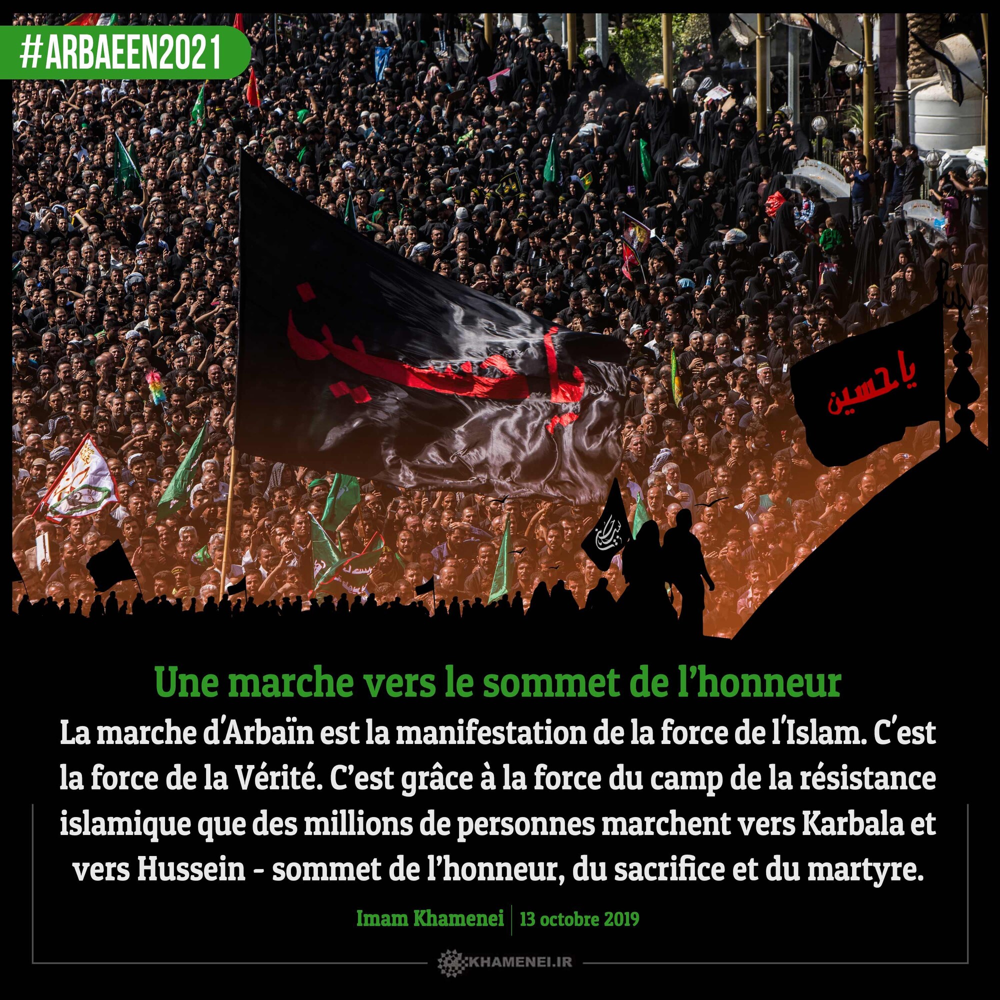 La marche d'Arbaïn est la manifestation de la force de l'Islam. C'est la force de la Vérité. C’est grâce à la force du camp de la résistance islamique que des millions de personnes marchent vers Karbala et vers Hussein - sommet de l’honneur, du sacrifice et du martyre. Imam Khamenei, [13 octobre 2019]